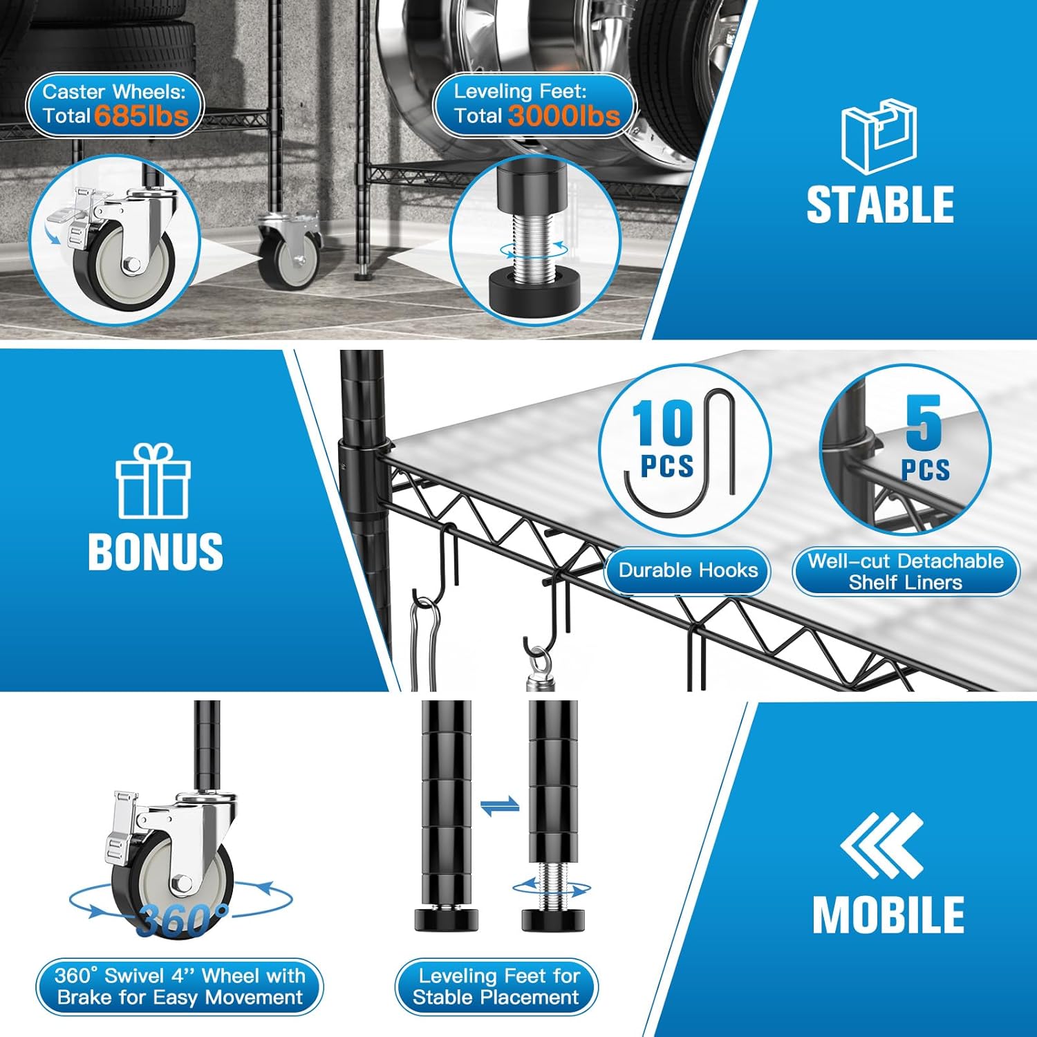 - WHAT YOU GET: 5 x Wire Shelves, 4 x Upper-Pole, 4 x Bottom-Pole, 40 x Clip Sleeve, 4 x 4" Wheel, 4 x Leveling Feet, 10 x 3cm Hook, 5 x Shelf Liners, 1 x Installation Instructions