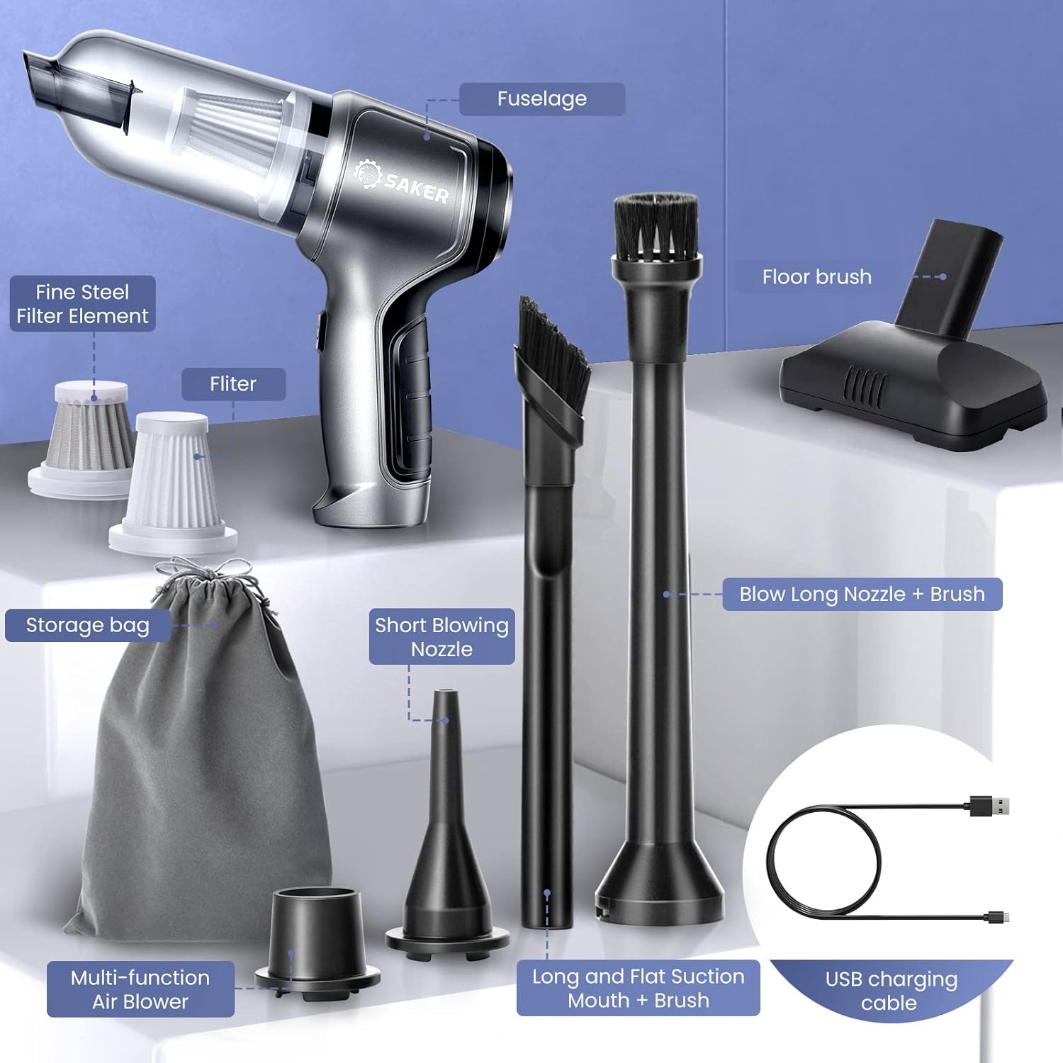 - 【3-In-1 Multifunctional Vacuum Cleaner】-The Saker handheld vacuum cleaner is equipped with 3 different types of nozzles to meet all your daily cleaning needs. It can not only be used as a vacuum cleaner for daily cleaning of house, vehicle and pet hair, but also as an air pump for inflating life rings or life jackets, and as a vacuum pump for storing bags and other purposes.