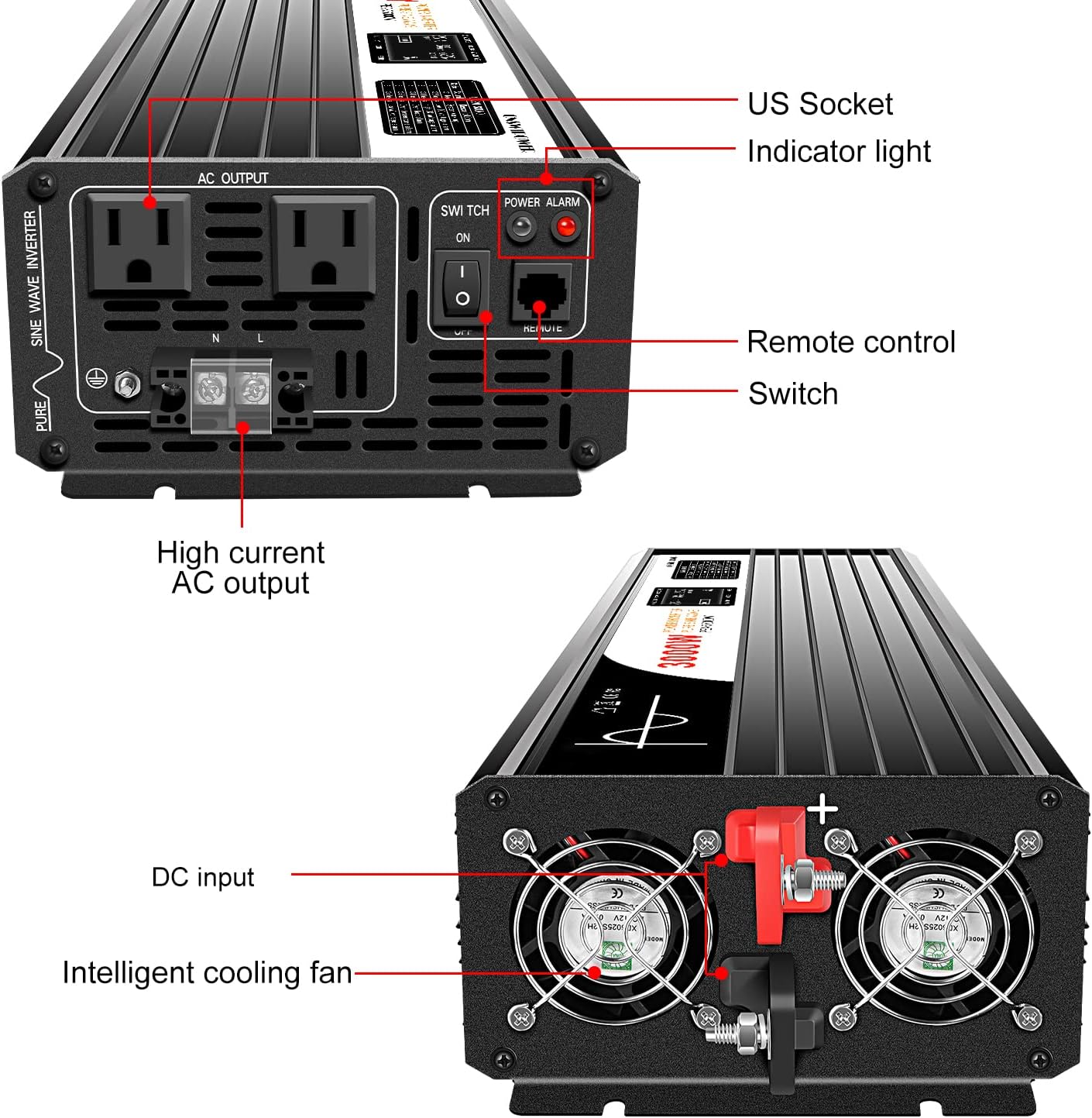 - 【LCD display and remote controlIer】inverter with remote control: The cable is 5 meter long, and the long cable will help you easily control the on/off of the inverter. The LCD display is easy to observe the input voltage, output power.And also our inverter with High quality true copper inductance, filter the wave form, ensure the true pure sine wave AC output, safeguard your equipment.