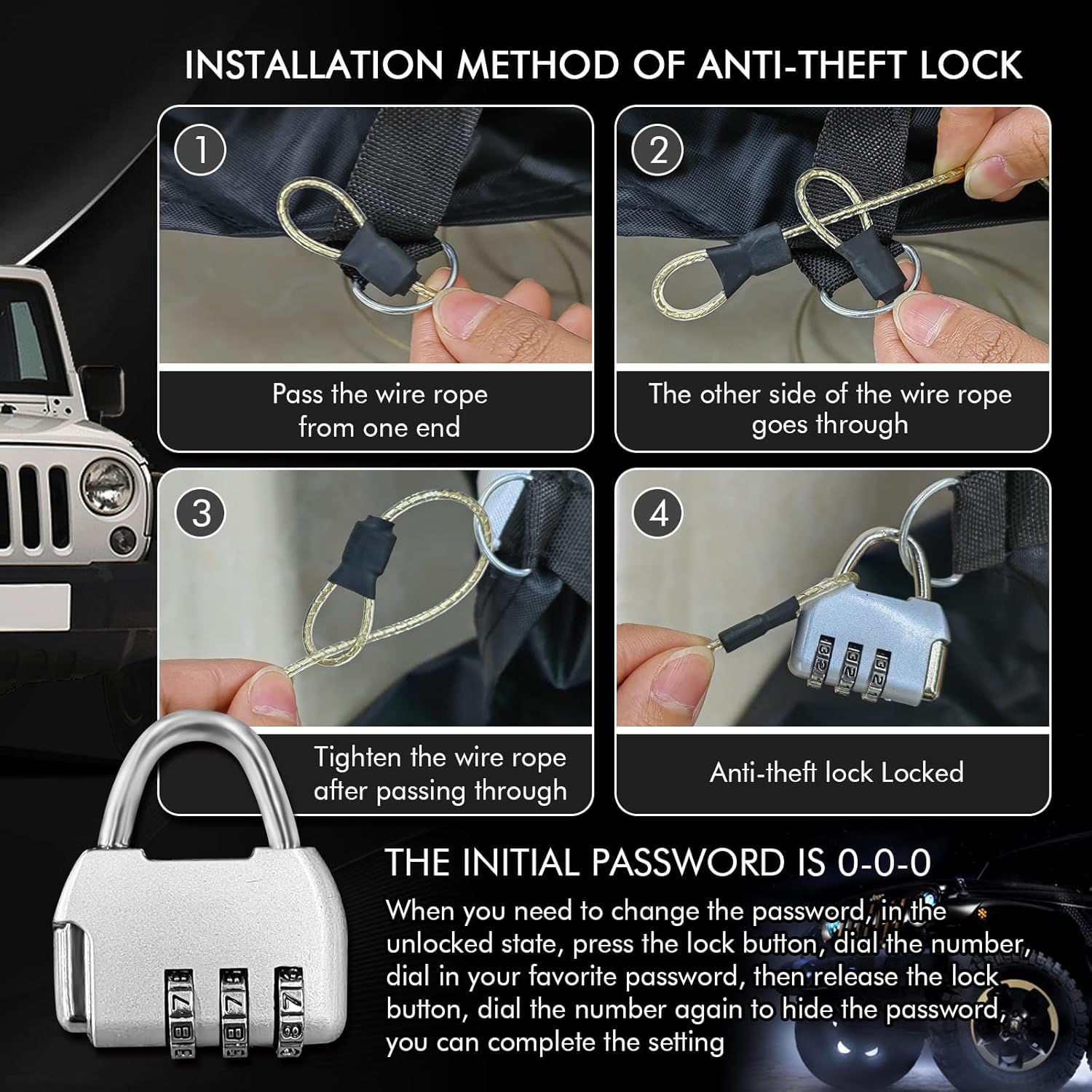 - 🚙【Upgrade Windproof Design】①A windproof fixed buckle pass through the middle of the car for easy fixing; ②2 windproof belts at the front and rear; ③4 straps to tie the cover to the four wheels; ④Elastic band at the bottom can easily adjust the size of the cover; ⑤Double stitching ensures that the cover will not tear easily, making it more durable; ⑥The included safety latch secures the cover. Multiple upgraded designs keep your protective cover from being blown away even in strong winds.