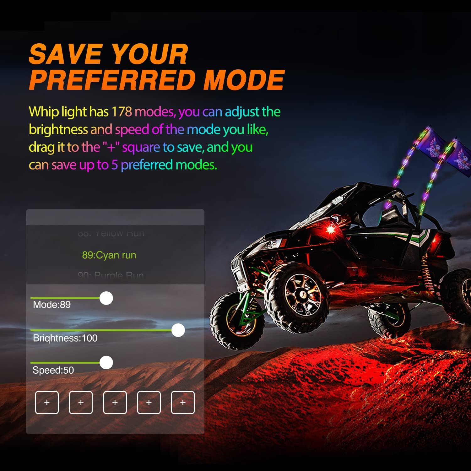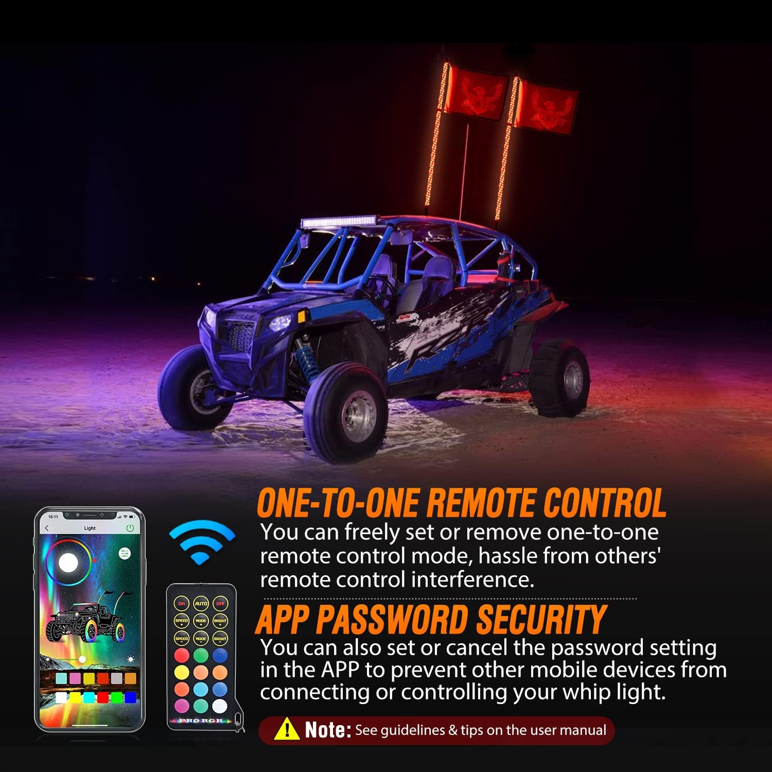 - 【APP & Remote Control】Dual control by Bluetooth APP and RF remote with a hook, no more worries about losing the remote. And you own more superpowers to control this magical whips, including grouping with friends' devices, countless RGB colors & editable chasing modes options, amazing syn-with music modes and being able to adjust color brightness/speed/colors.