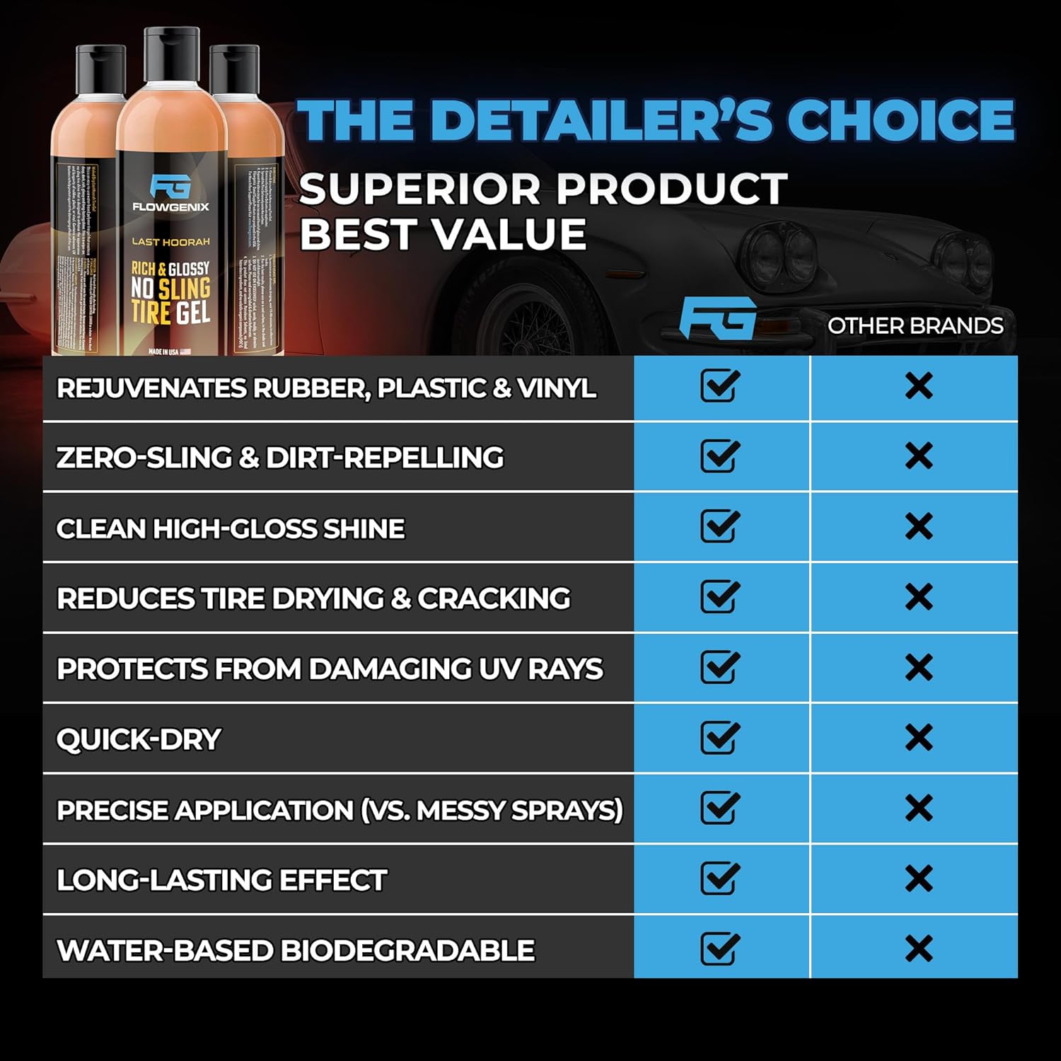 - ✅ PROTECT & SHINE: Exterior surfaces of your vehicle fade over time due to exposure to sun and outdoor elements. These factors cause tires and surfaces of your vehicle to appear extremely dry and worn. Last Hoorah’s tire dressing wipe-on, ZERO-SLING, ANTI-STICK, DIRT-REPELLING formula enhances the appearance and longevity of rubber, plastic, and vinyl surfaces by creating a protective layer to defend against the effects of damaging UV rays, weather, and more while achieving a truly clean, high gloss shine.