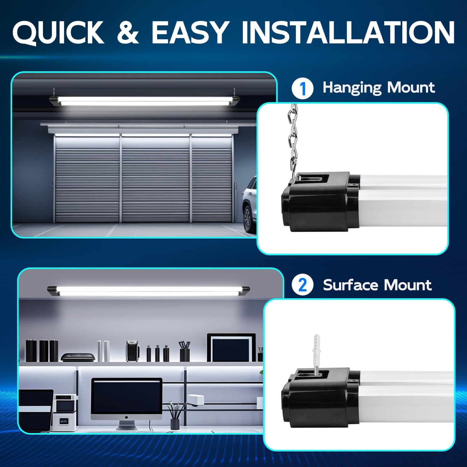 - Linkable Design : Easily connect up to 6 pcs of these 4ft linkable LED shop lights using the plug connection. Create a well-lit environment in your garages, workshops, workbench areas, storage areas, warehouses, basements, and equipment rooms.
