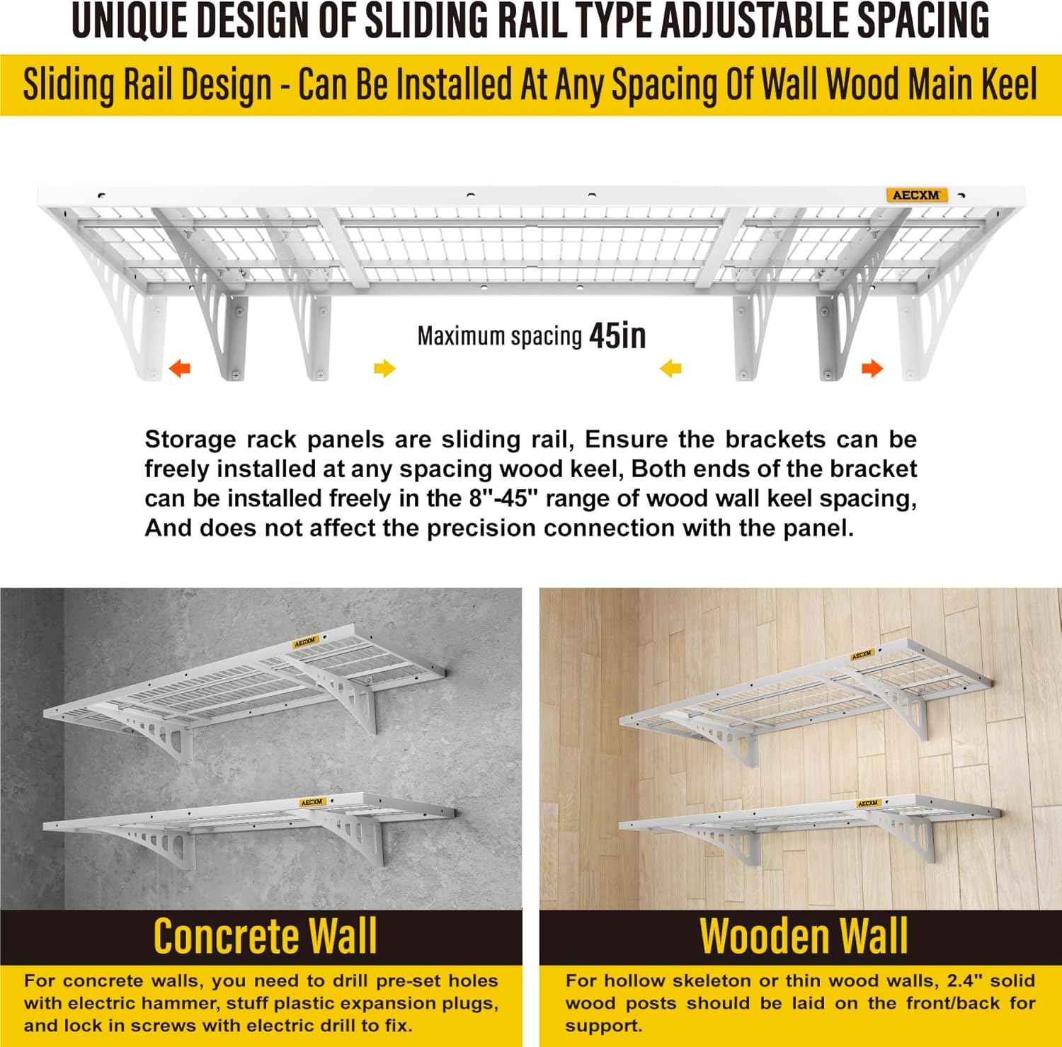 - Innovative Design: Unlike fixed-spacing systems, Aecxm garage storage shelves wall mounted feature sliding rail screws, allowing installation on wood studs spaced anywhere within the 48-inch garage shelf length. No more compatibility issues with uneven stud spacing