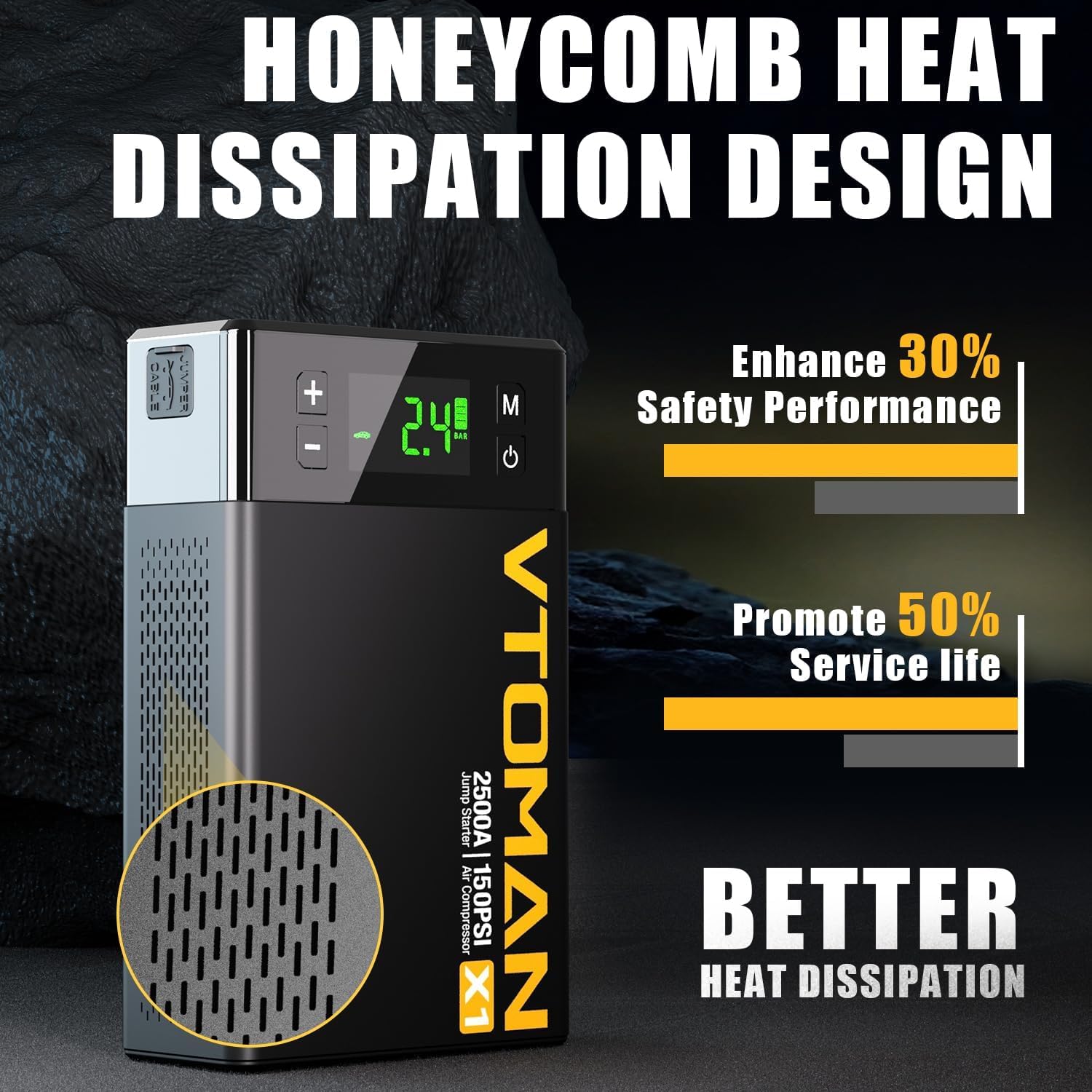 - 【Industry-Leading Thermal Innovation】Jump box and air compressor unique honeycomb heat dissipation design enables the X1 jump starter to obtain more powerful heat dissipation performance, so the safety performance of the X1 car jump starter is Enhanced by 30%, and its service life is promoted by 50% - making it the most tough emergency power solution for modern vehicles.