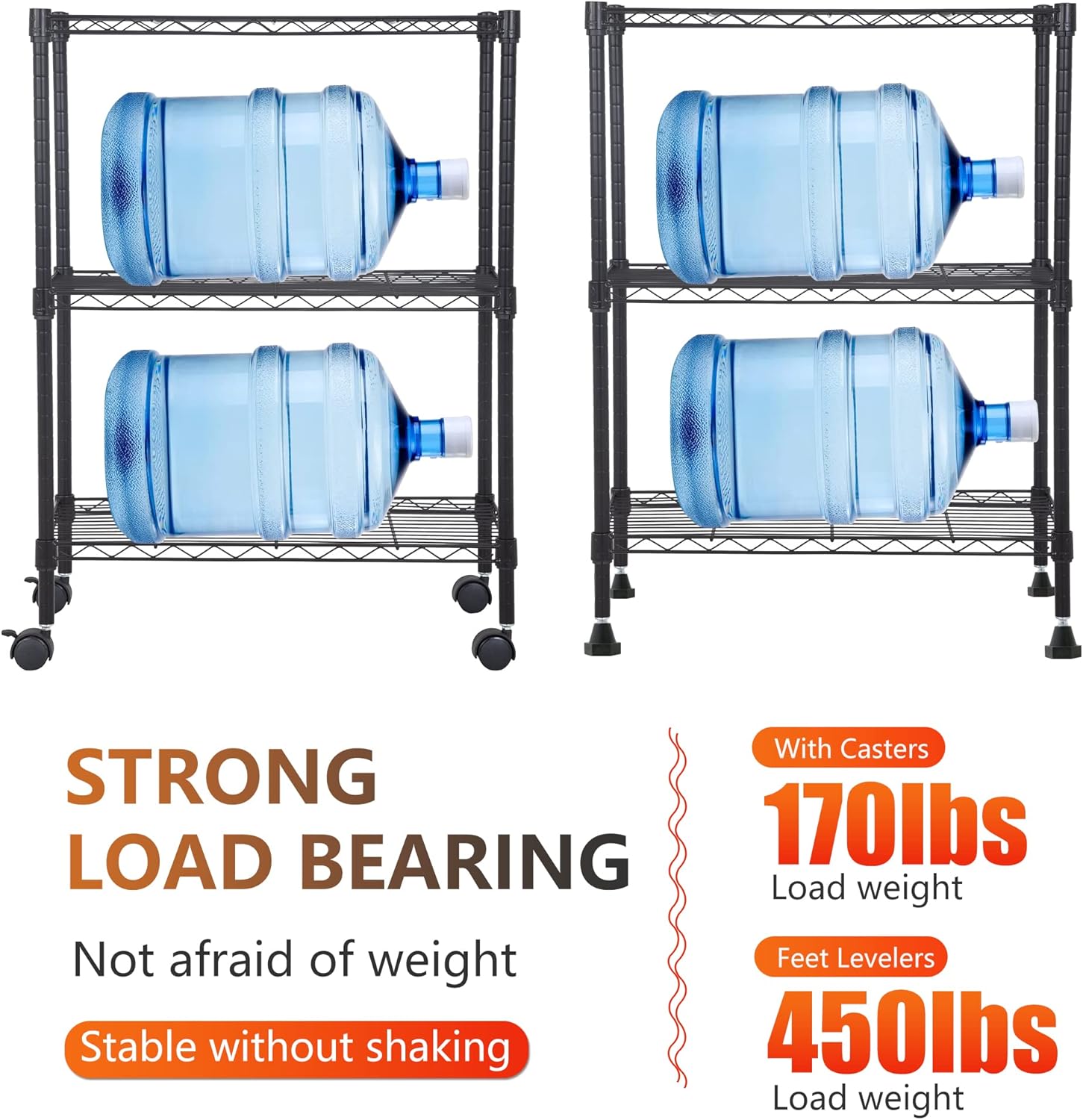 - ✔ [Strong bearing capacity] When the scaffold is equipped with foot nails, each layer can hold 150 pounds, with a total bearing capacity of 450 pounds. When the rack is equipped with movable casters, its total load is 170 pounds. The electrical rack in the kitchen can be used to place some commonly used living items without worrying about the deformation of the storage rack.