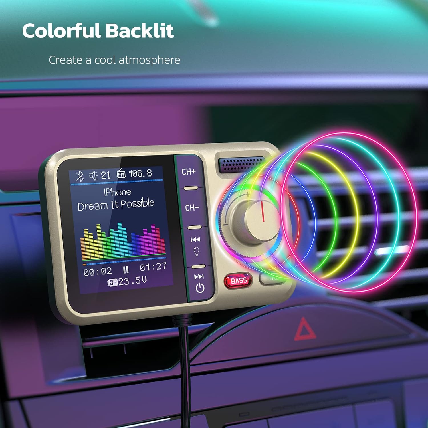 - Big Color Screen & Air Vent Clip: Our new car bluetooth adapter adopts a big color screen for more information and better visual experience. Now you can read more information such as incoming phone numbers, car battery voltage, FM frequency, track name, etc. In addition, the air vent installation offer you better view angle for your safety.