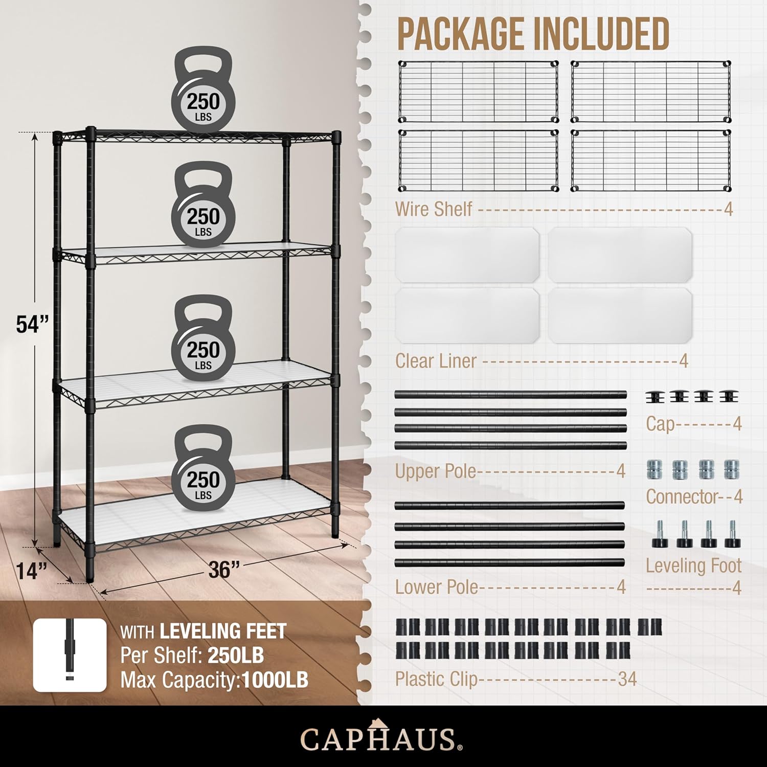 CAPHAUS NSF Adjustable Height Wire Shelving Unit w/Liner, Basement Storage Shelving, Metal Steel Storage Shelves, Garage Shelving Storage Organizer, Utility Shelf, 4-Tier No Wheels W/Liners, Black