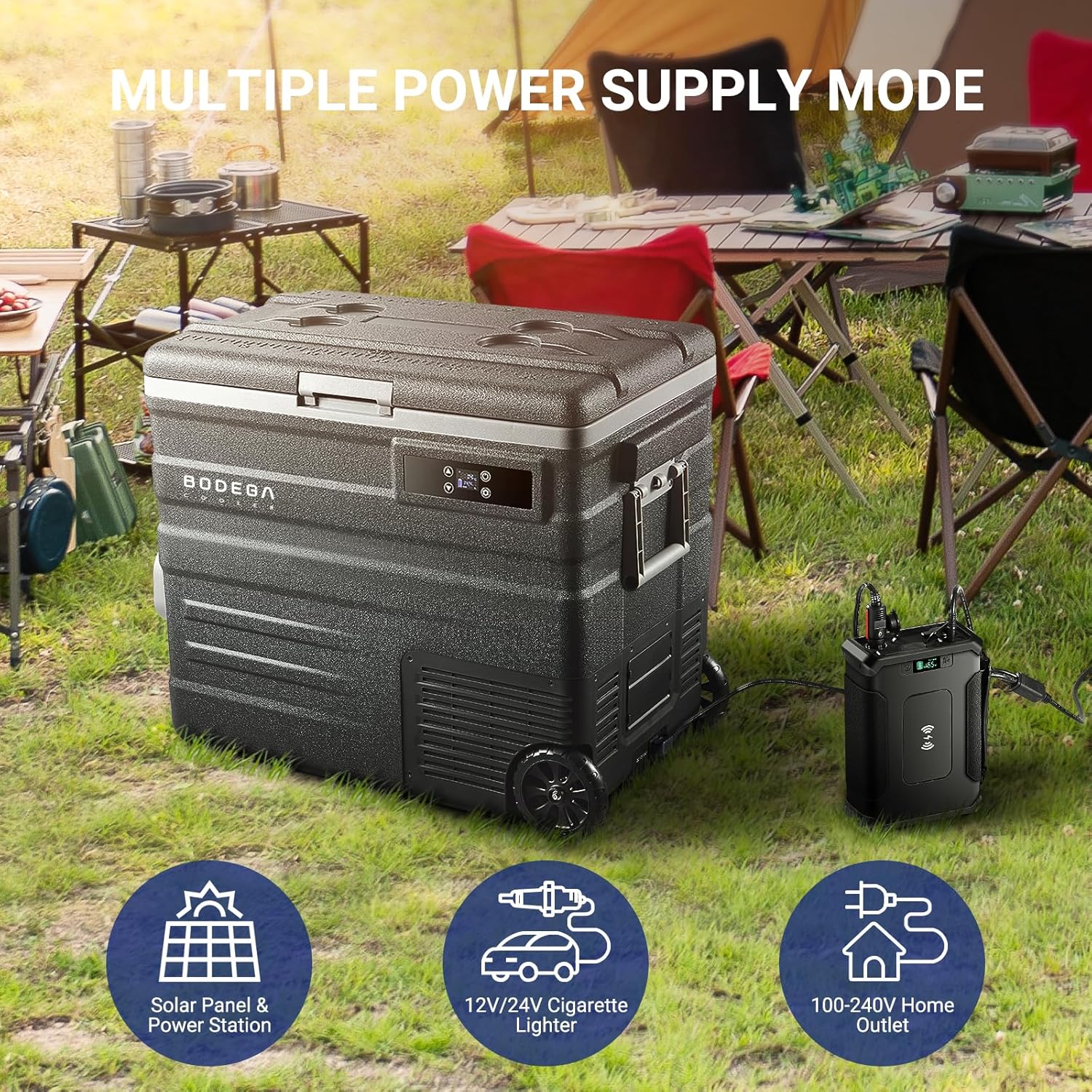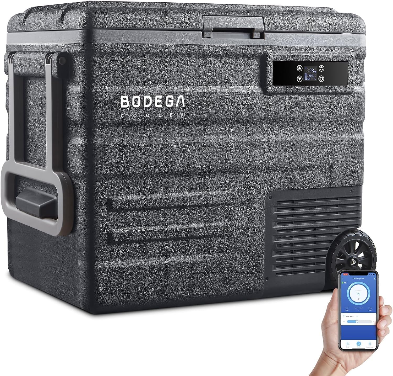 - 【Handle & Wheels Design】12v car refrigerator has heavy-duty handle and wheel is easier to move and portable.This 12 volt fridge with friendly design is very convenient for your daily use.BODEGACOOLER car refrigerator compatible with various power sources to meet your life needs.