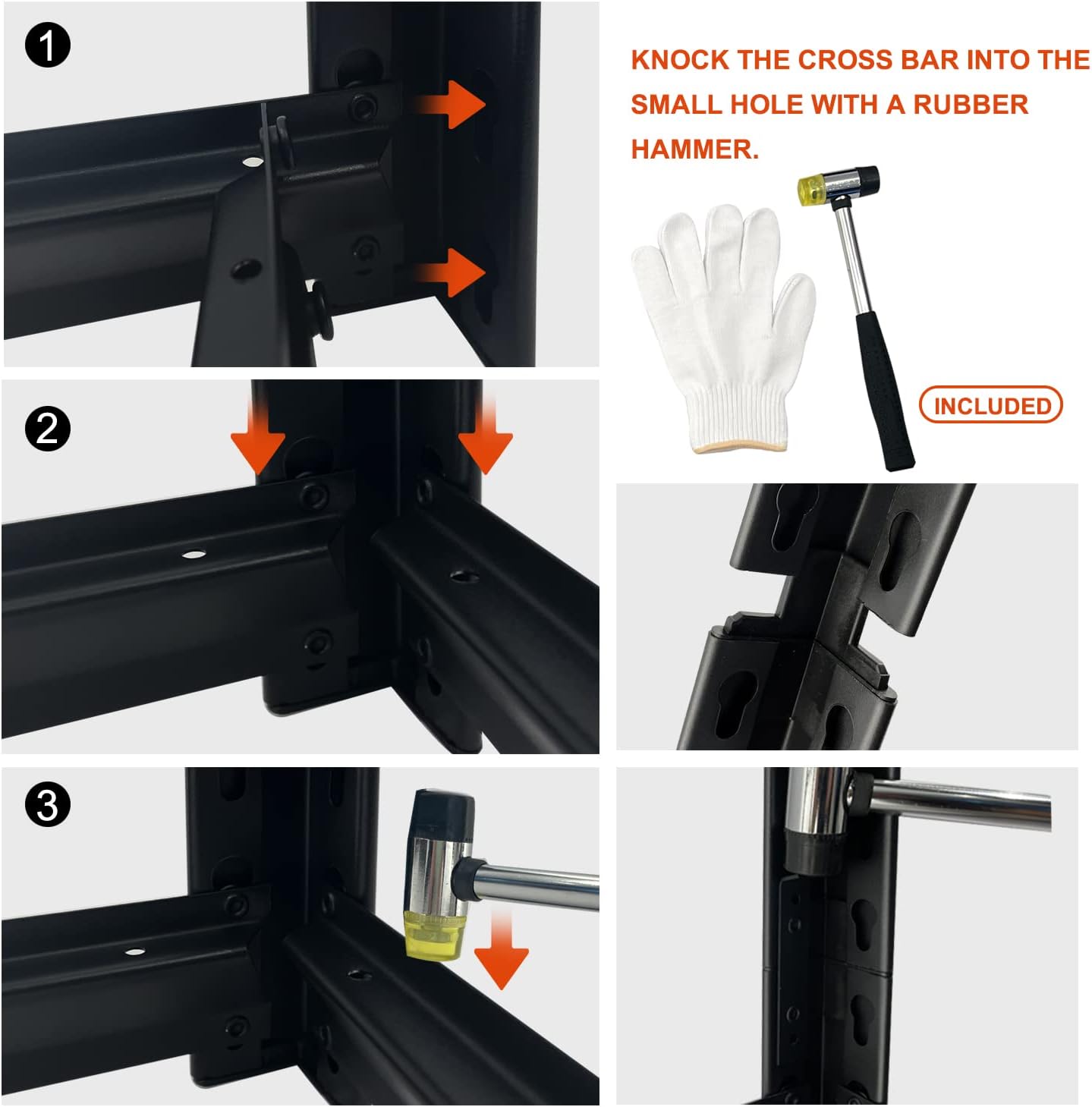 - SIMPLE ASSEMBLY: Assembly is a snap thanks to the boltless design, the package contains the parts of the shelf and all the tools you need, including hammer, gloves, 16pcs Rubber foot pad, 4pcs connector, so you can easy to put together without any other tools.