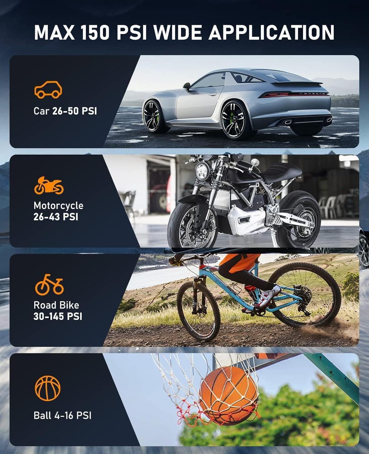 - Recommended Uses For Product : Tire Inflation for BIke, Motorcycle, Car. Air Pump for Sports Equipment Inflation, such as Basketballs, Football, Rugby. Air Pump for Home use, such as Balloons and other Inflatables Tire Inflation for BIke, Motorcycle, Car. Air Pump for Sports Equipment Inflation, such as Basketballs, Football, Rugby. Air Pump for Home use, such as Balloons and other Infla… See more