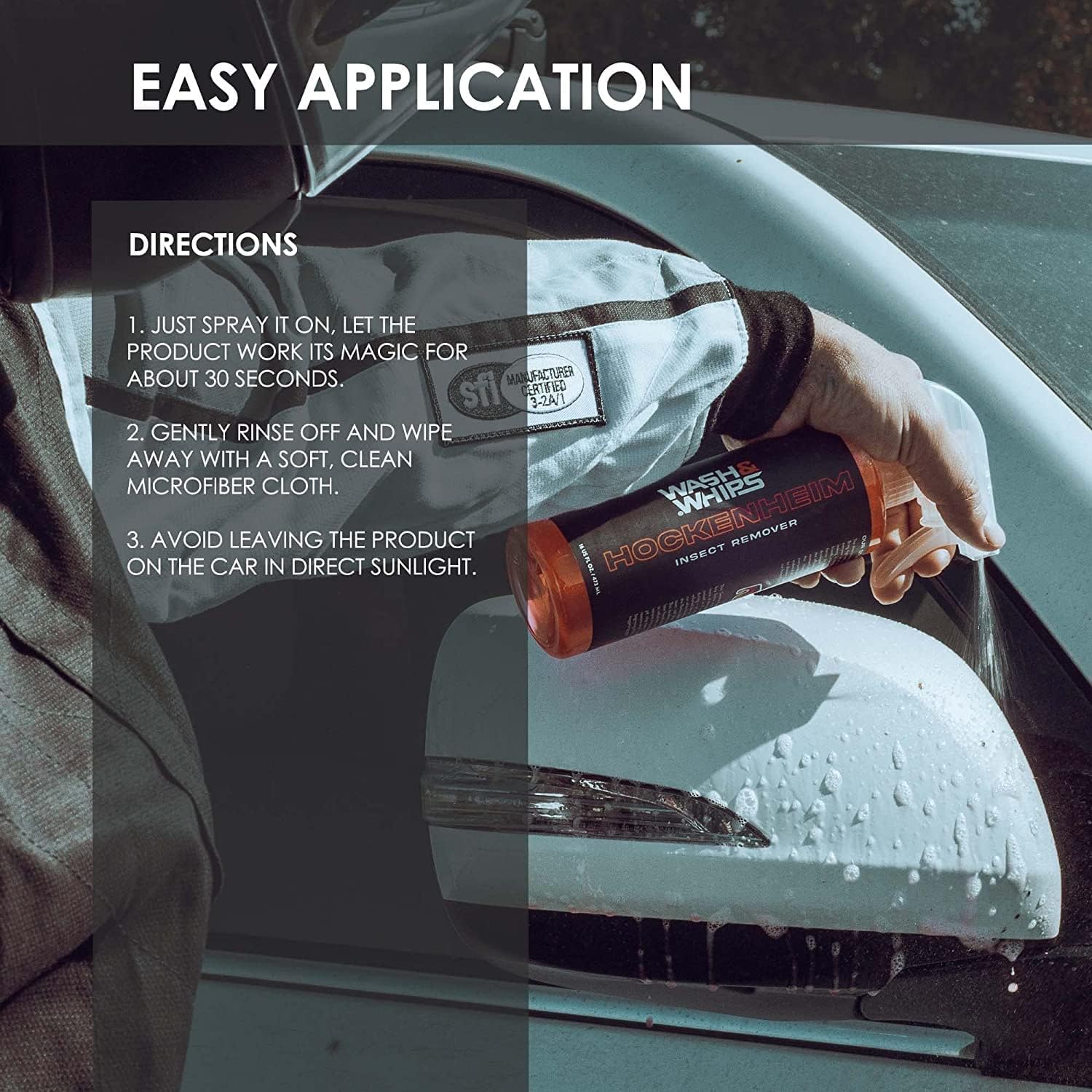 - DIRECTIONS: Just spray it on, let the product work its magic for about 30 seconds and gently rinse off and wipe away with a soft, clean microfiber cloth. Avoid leaving the product on the car in direct sunlight.