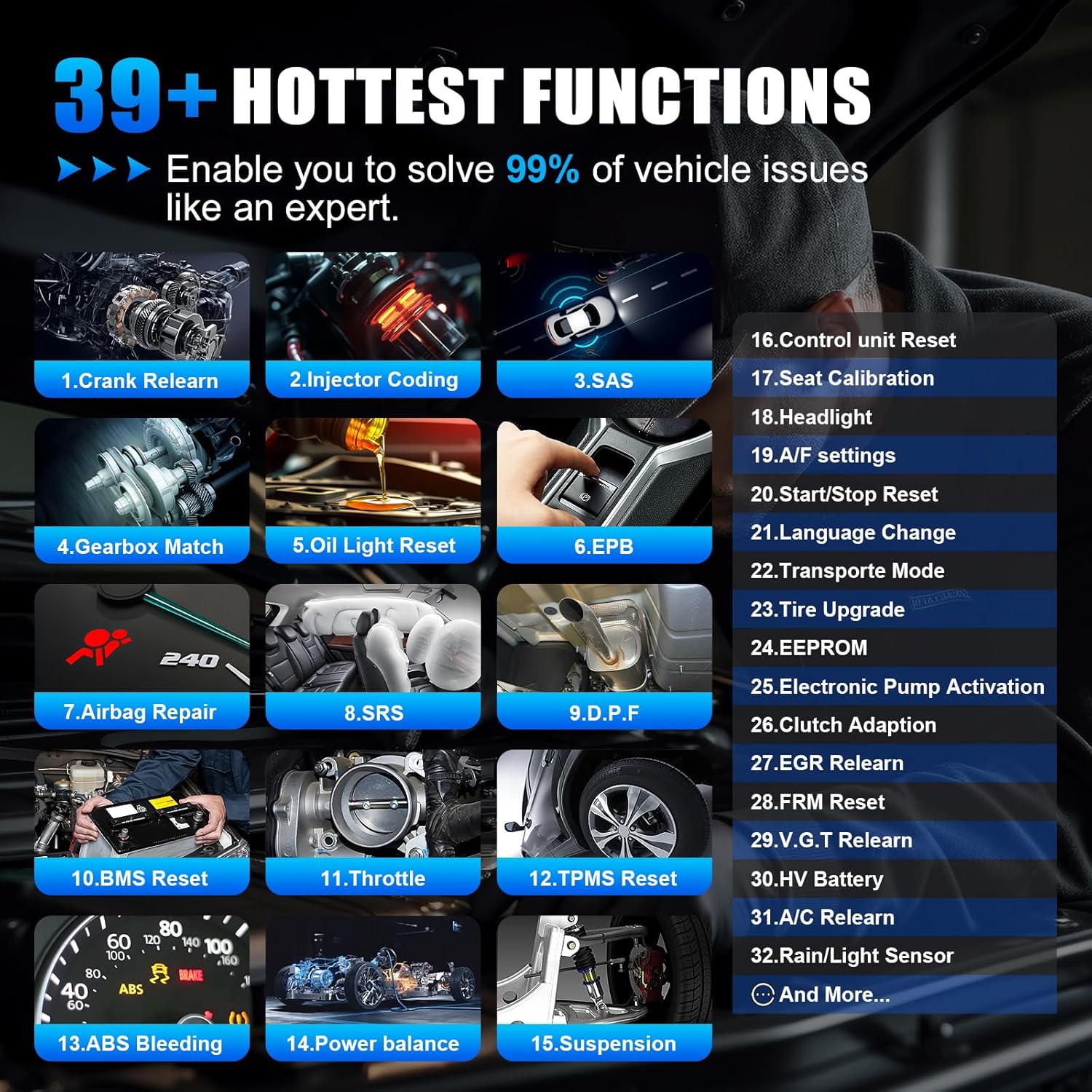 - 39+ Services/Resets/Adaptations/Relearns/Calibrations: XTOOL D7S full system car scanner diagnostic tool tackles 99% of common car issues through its 36+ special functions, including Oil Reset, EPB, SAS, BMS, Throttle Reset, Injector Coding, ABS Bleed, TPMS Reset, Power Balance, etc and also covers specific-vehicle functions like Crank Sensor Relearn, ABS Initialization, Cylinder Power Balance, Fuel Trim Reset, Idle Relearn etc. This car diagnostic scanner enhances efficiency, making repairs and maintenance hassle-free. Tip: DO NOT for All vehicles, please check compatibility first