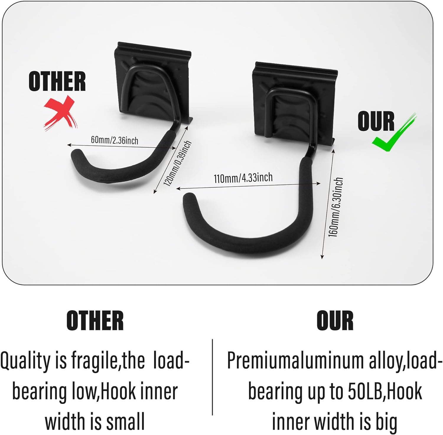 - Package includes: 4 bike hooks + 2 helmet hooks + 2 hook guide rails, bike hook specification 75*160*110mm, helmet specification 100*38*2mm, plate specification 405*100*2mm, suitable for 4 bike parks.