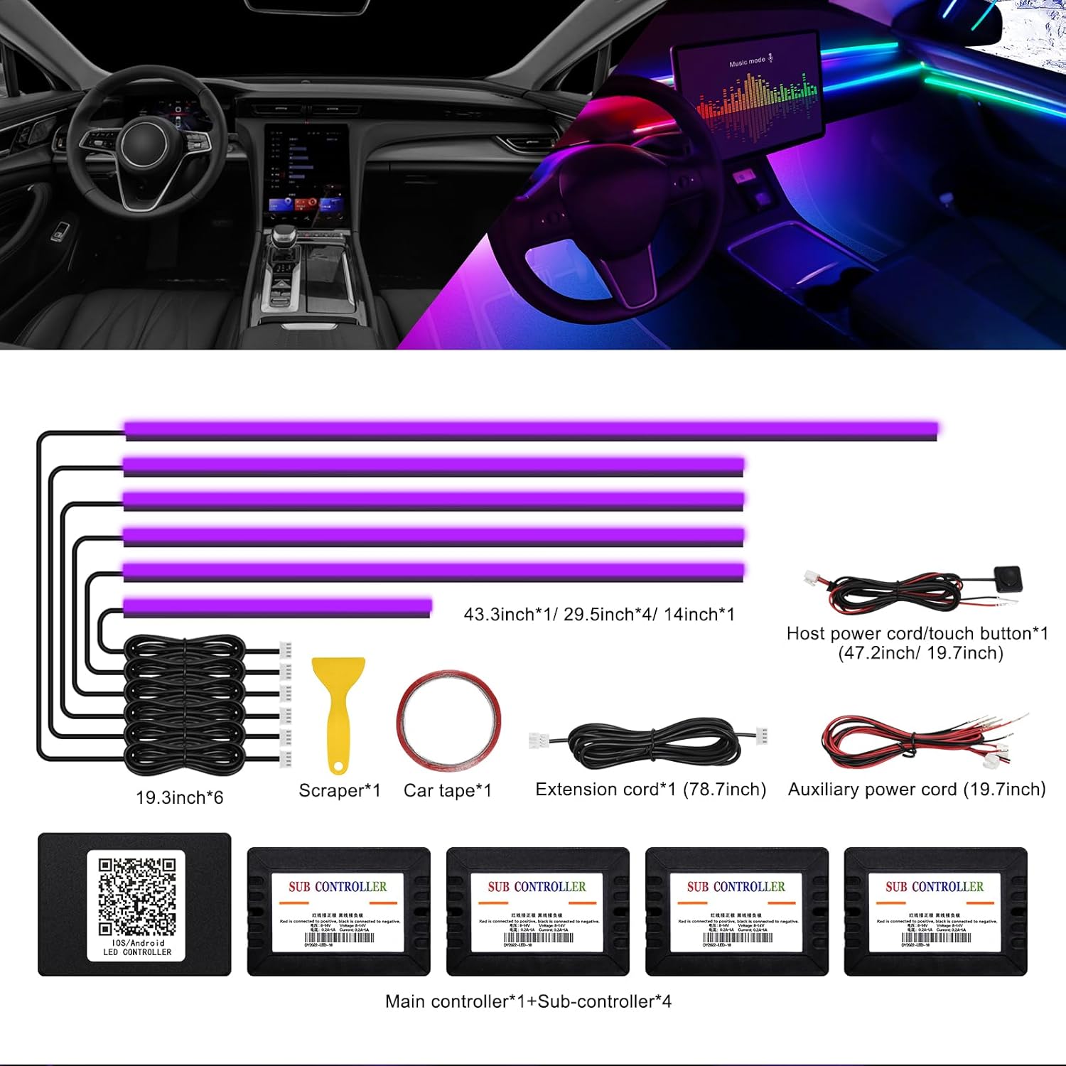 - 【High Bright & Uniform】The RGB Acrylic Ambient Light Strip have super bright LED and acrylic lens and contains 6 LED strips (4*29.5inch+1*43.3inch+1*14inch) , also comes with 1 main controller and 4 sub controllers,and can be flexibly installed on any car by DIY without disorganized, which is plug and play, and and this acrylic light evenly spread over the lamp strip is brighter, more uniform and softer than other optical fiber lamps that rely on only one LED.