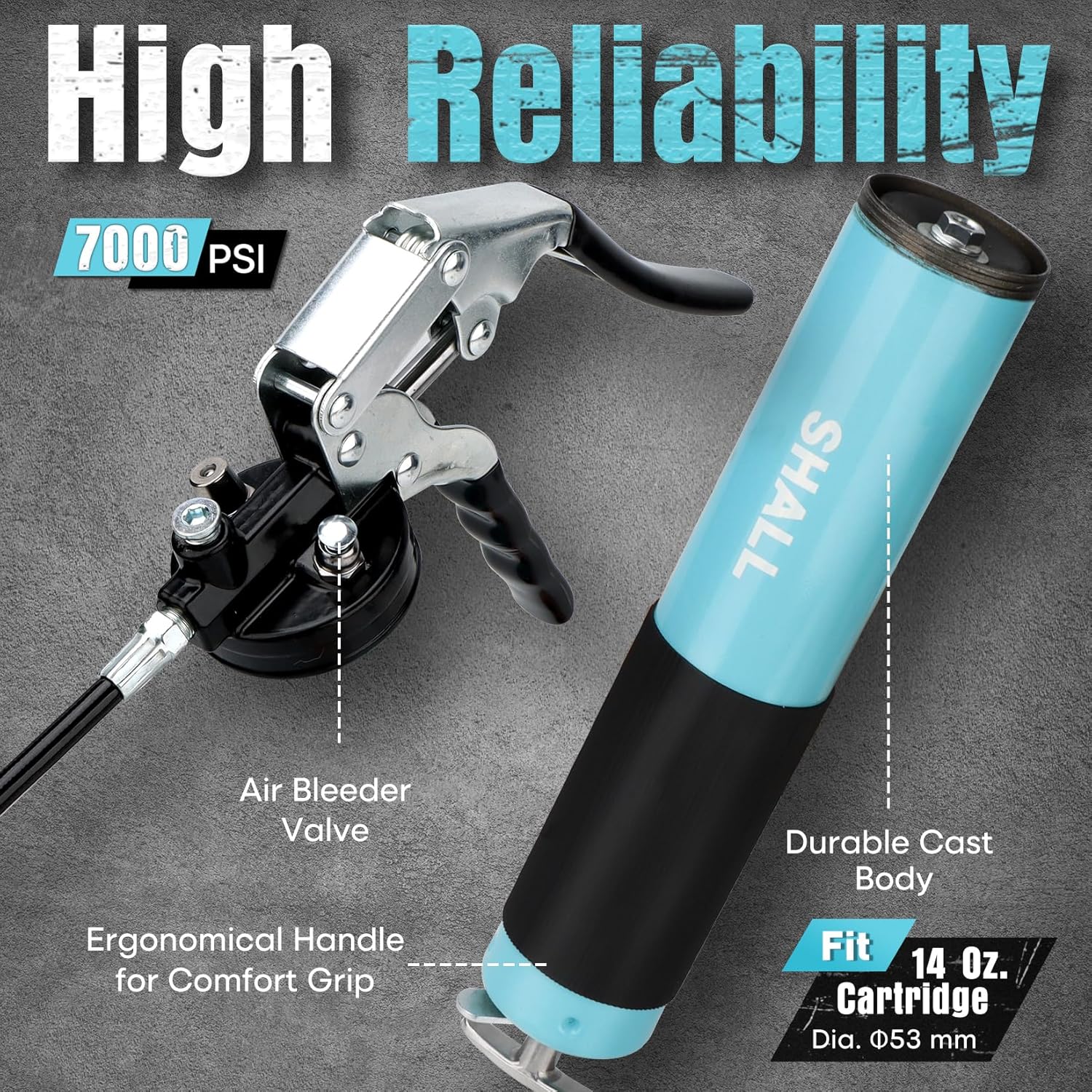 - Robust Build Quality: SHALL pistol grip grease gun is constructed of premium quality durable die cast aluminum, guaranteeing a 7000 PSI Max working pressure and leakage-free performance