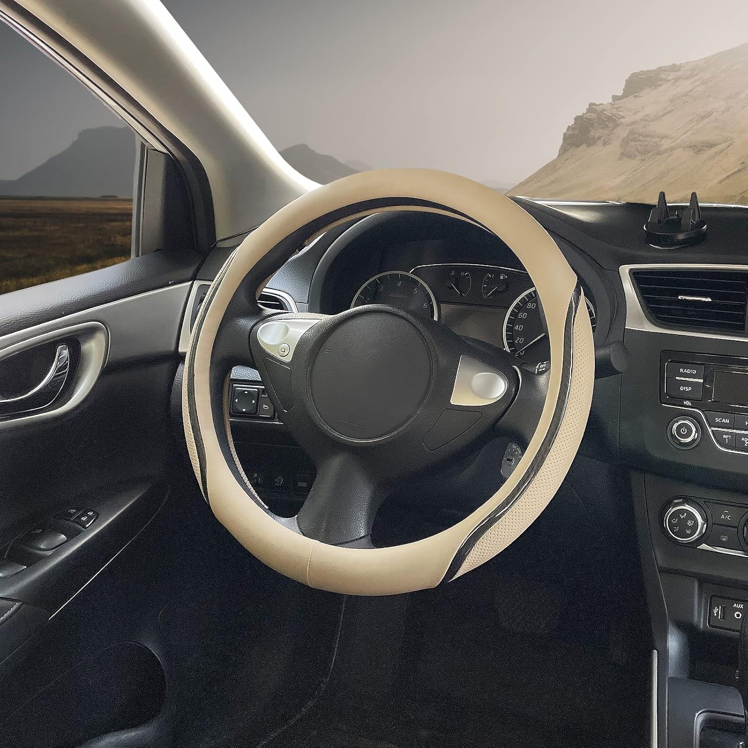 Car Steering Wheel Cover Beige, 14.5-15 inch Steering Wheel Covers with Coasters Microfiber Leather Carbon Fiber Breathable Anti-Slip Durable Universal Auto Steering Wheel Protective