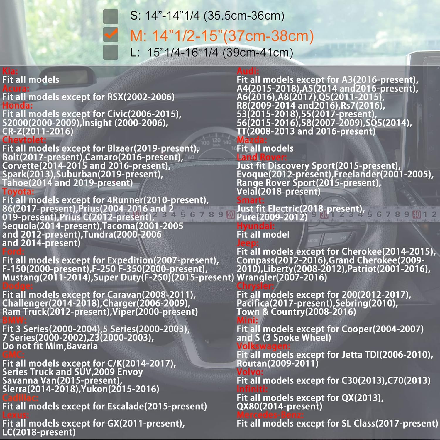 - Fits 98% of Models: The car steering wheel cover is suitable for standard M-size steering wheels from 14 1/2 to 15 inches. If you feel it's difficult to put it on, please use a hair dryer to heat it for about 3 minutes to soften the inner rubber