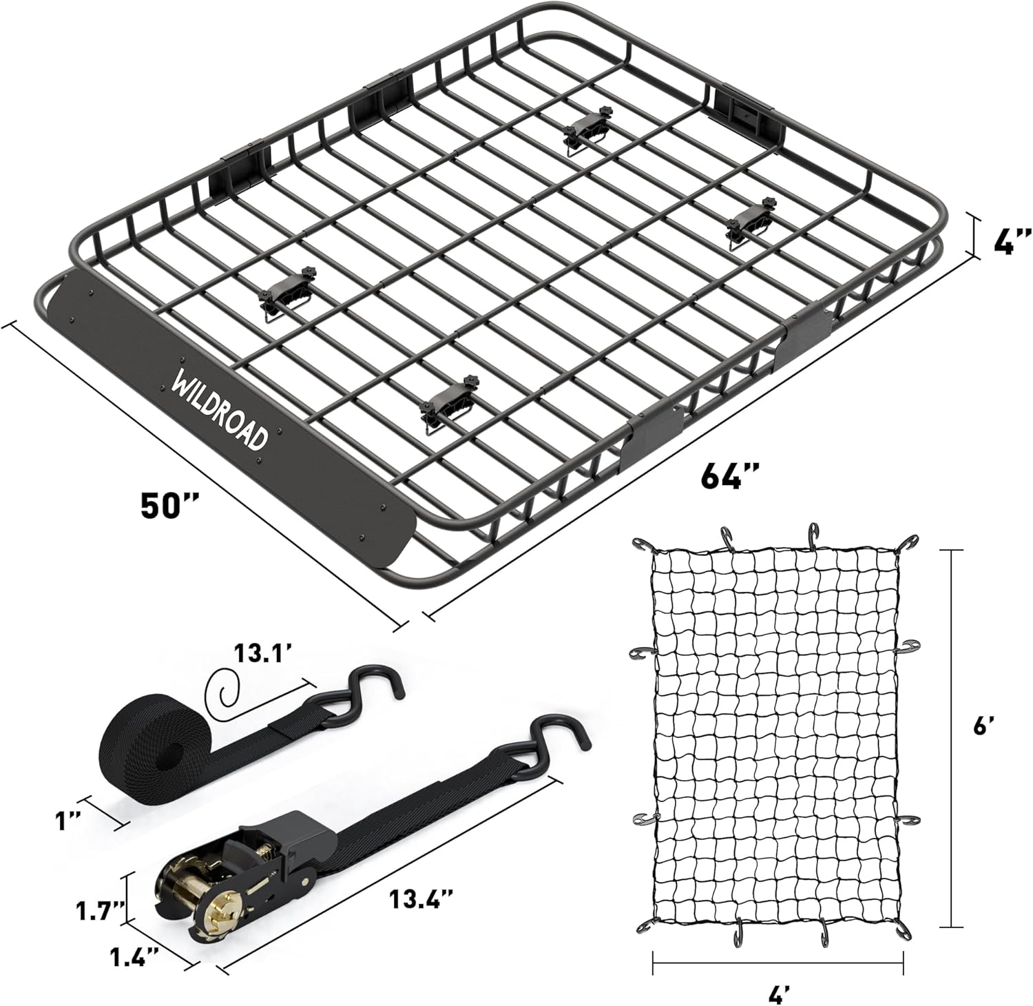 Wildroad Roof Rack Cargo Basket, Upgraded 4” Fence Wide Car Roof Basket, 64"x 50"x 4" Universal Car Top Carrier Basket with Super Duty Bungee Cargo Net and Ratchet Straps Fits for SUV Truck Cars