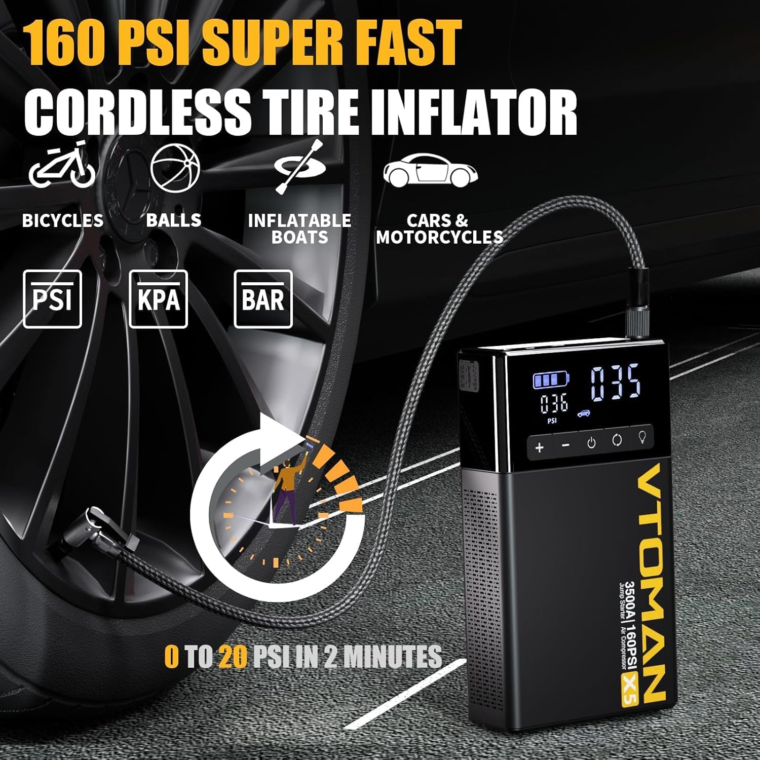 - 2 Mins Super Fast Inflation - The VTOMAN X5 car battery charger jump starter equipped with an 160psi digital air compressor that can inflate a typical car tire to 20 PSI in just 2 minutes, 2 time faster than others. Additionally, the X5 features real-time tire pressure detection and an auto shut-off function when the set PSI is reached. The set also includes an extension air hose and 3 different nozzles, allowing you to inflate cars, bikes, balls, mattresses, pool floats, etc.
