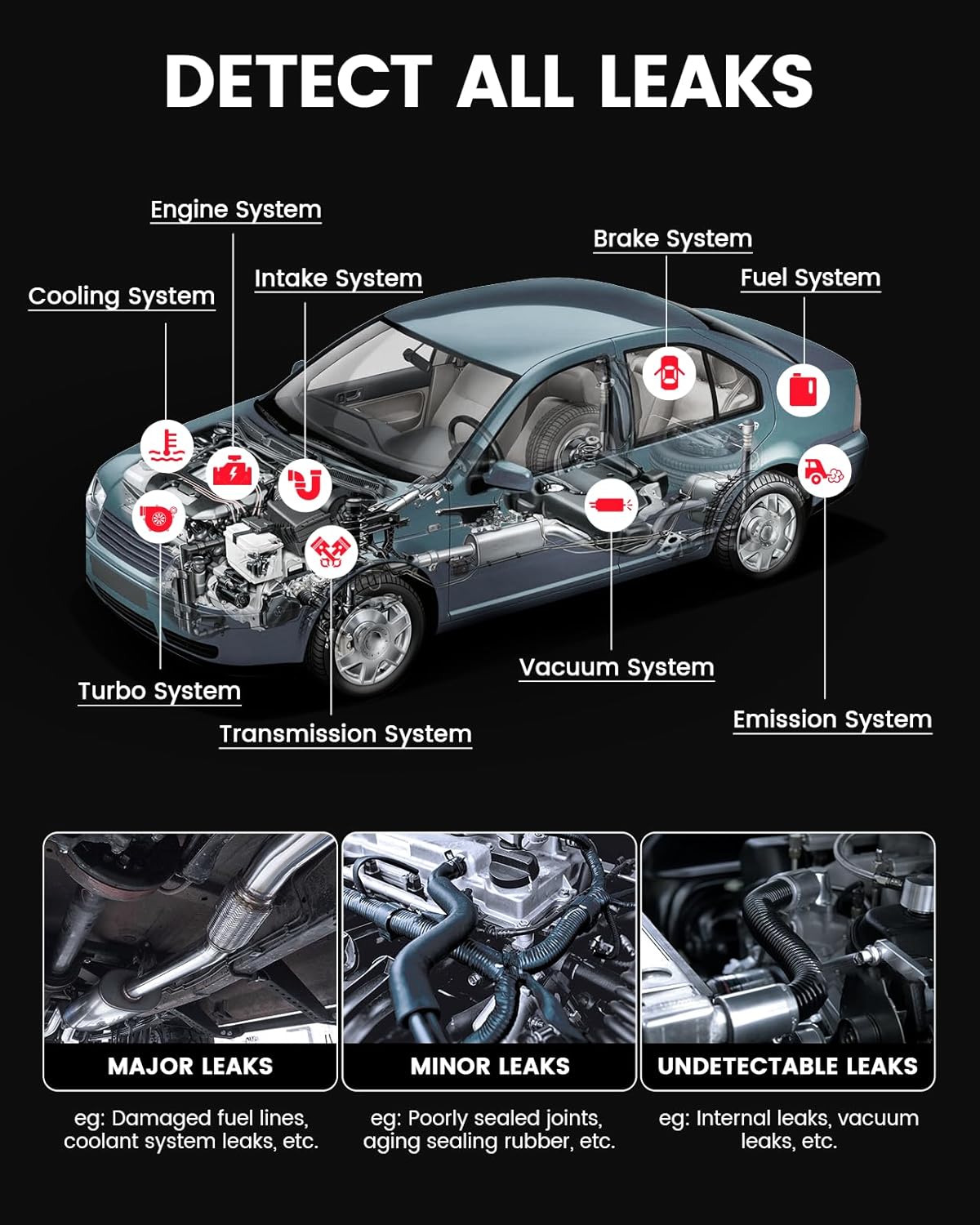 - DETECT EVERY TYPE OF LEAK: Our versatile smoke machine for cars includes multiple vehicle cone adapters, a smoke delivery hose, intake bladder, and full-size automotive cap plugs. It seamlessly fits various lines and hoses, ideal for hassle-free checks on vacuum, fuel, engine, intake system and more