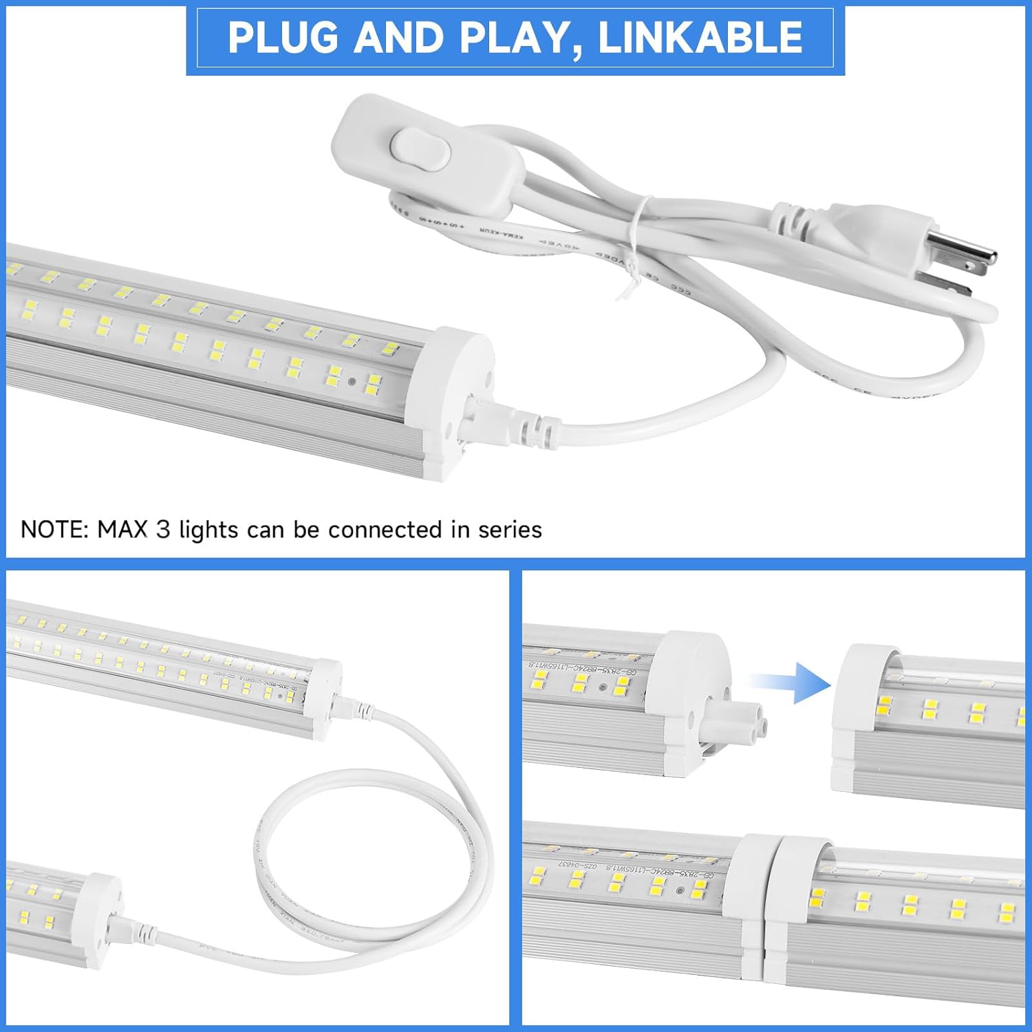 - 【Linkable & Humanized Design】-Our 8ft led shop lights are linkable and plug & play. You can connect up to 3 light fixtures and avoid the complicated wiring. The prolonged 59-inch power cords with an on/off switch is practical for you to install the light where you want.
