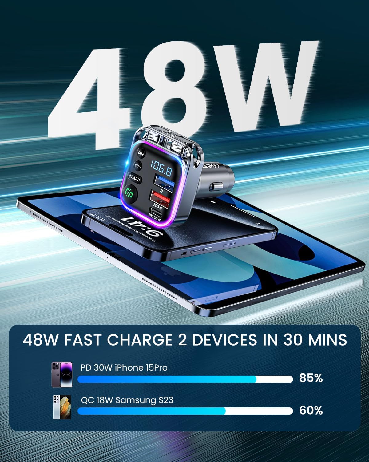 - 【PD 30W & QC 3.0】, This wireless bluetooth car adapters are equipped with PD 30W & QC3.0 Fast Charger, Its 30W USB C port can charge your iPhone to 85% in 30 mins. It comes with smart charge monitoring to prevent overload, overcharge, short circuit and other accidental situations