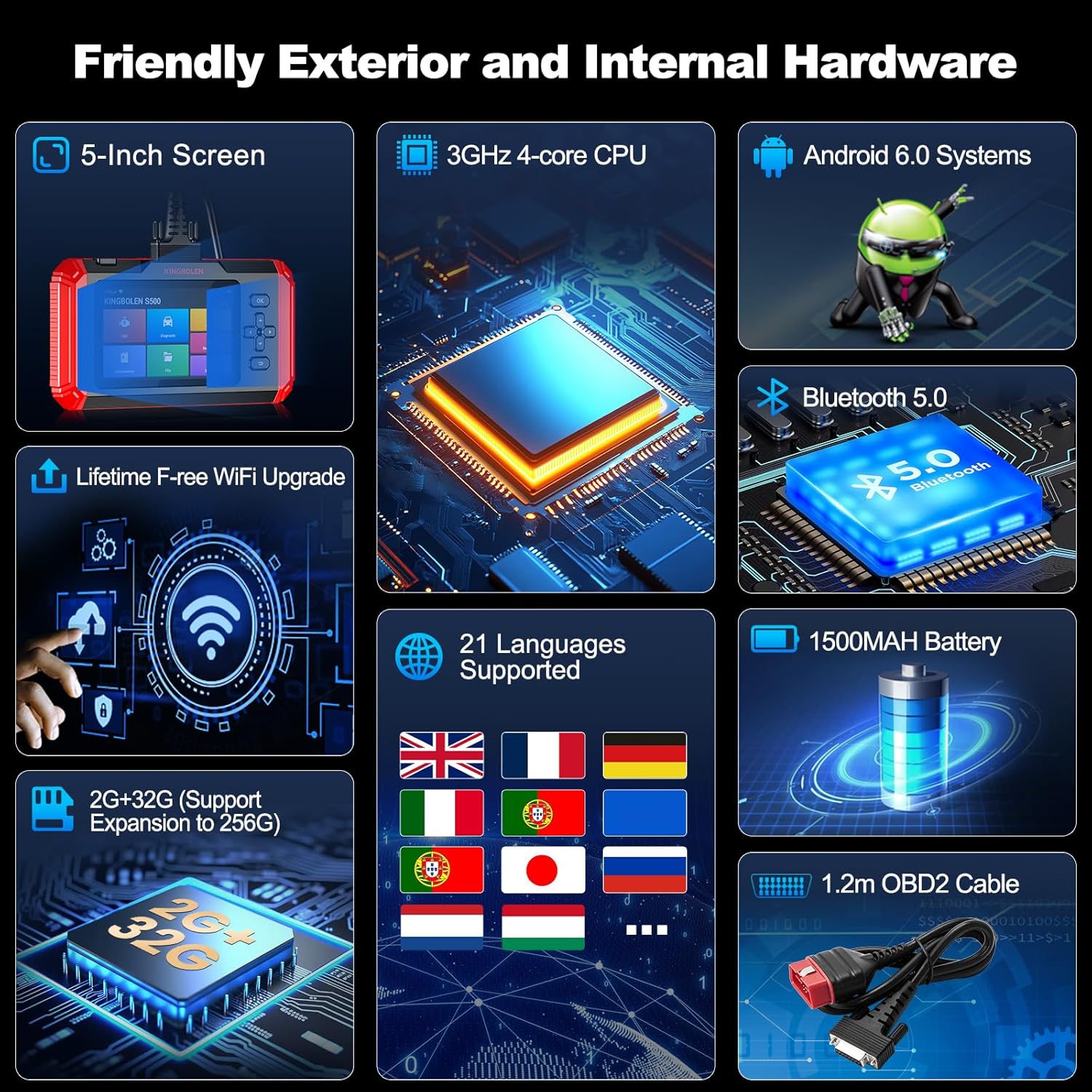 - 🚗 【5-Inch Touch Screen and 2+32GB BIGGER memory】KINGBOLEN S500 diagnostic tool is equipped with 5’’ gorilla glass touch screen. Compared with other brand scan tools, S500 code reader is more wear-resistant and scratch-resistant. Comes with 2GB ROM to ensure the software runs fast, and 32GB internal memory offers enough space to download more car modules and newest Reset. The S500 is NOT apply to all car models, if you are confused, please send your Car Brand, Model and Year to seller to check