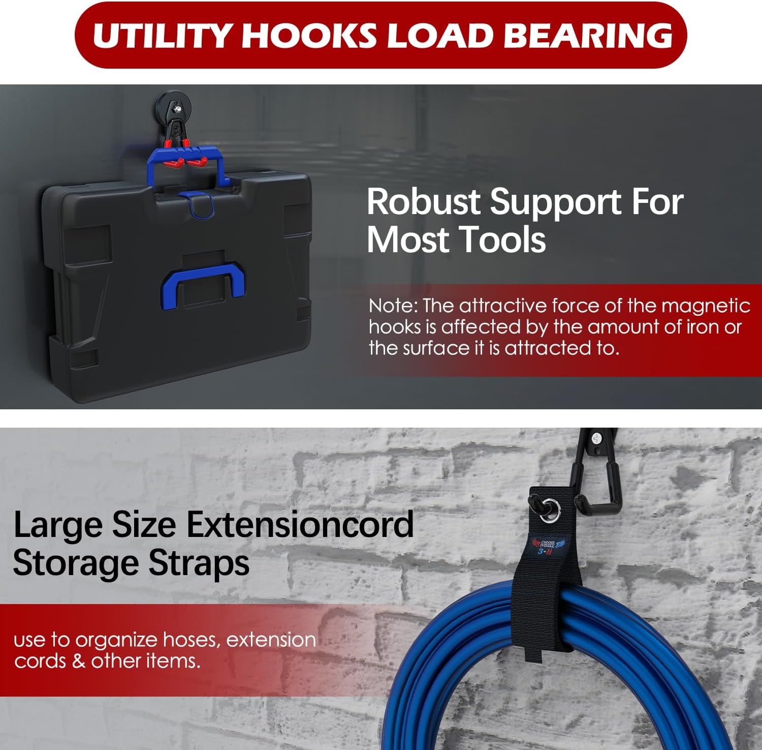 - Multi-functional Hook Magnets Heavy Duty: Your package includes 4 large U magnetic storage hooks, 2 extension cord organizer, and a comprehensive set of accessories comprising steel nails, flat washers, spring washers, and screws. For added convenience, the magnetic tool holder is accompanied by storage straps made of high-density nylon blend material with Velcro fastening, allowing for easy length adjustment and the hanging of various tools