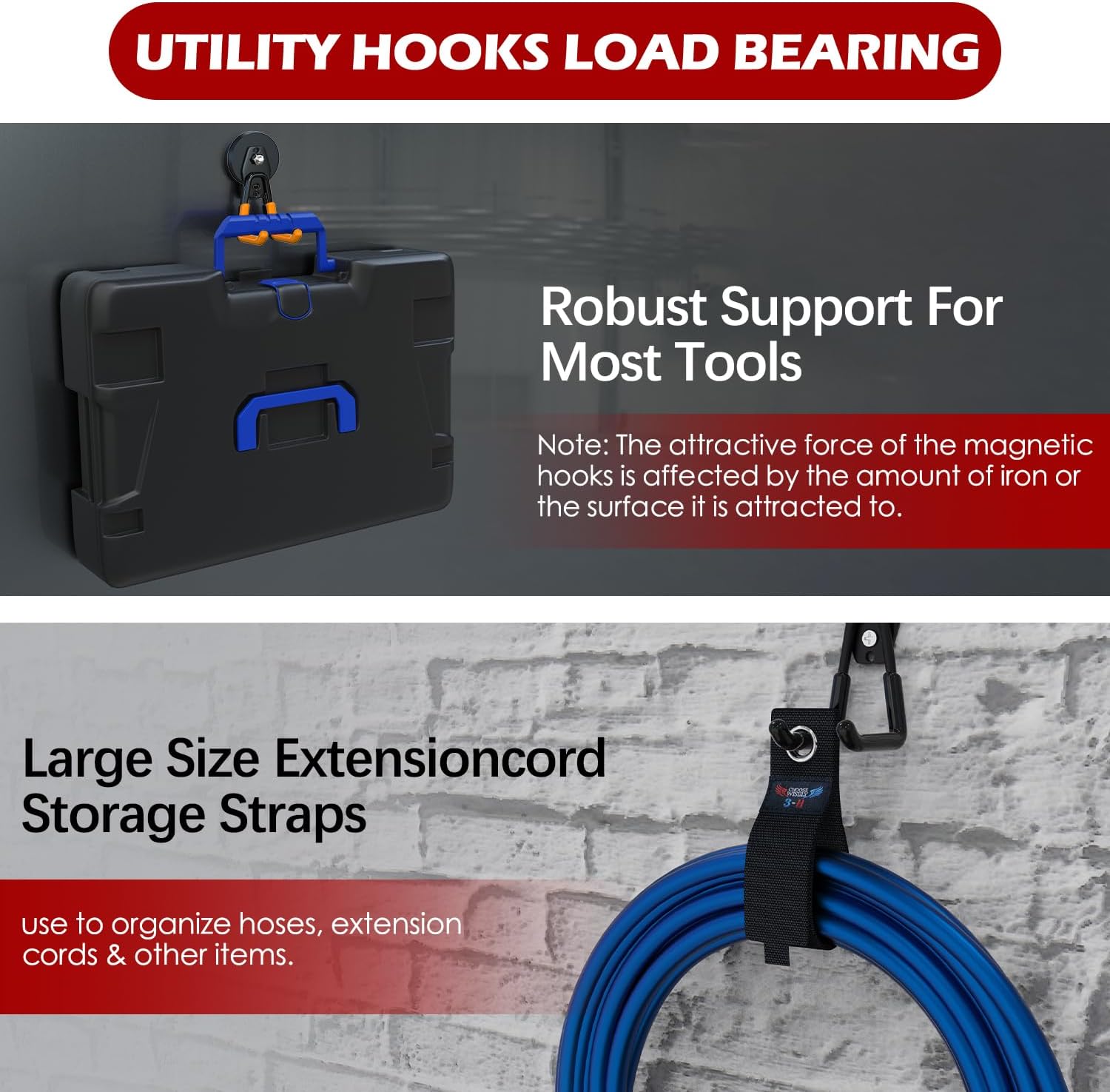 - Multi-functional Hook Magnets Heavy Duty: Your package includes 4 large U magnetic storage hooks, 2 extension cord organizer, and a comprehensive set of accessories comprising steel nails, flat washers, spring washers, and screws. For added convenience, the magnetic tool holder is accompanied by storage straps made of high-density nylon blend material with Velcro fastening, allowing for easy length adjustment and the hanging of various tools