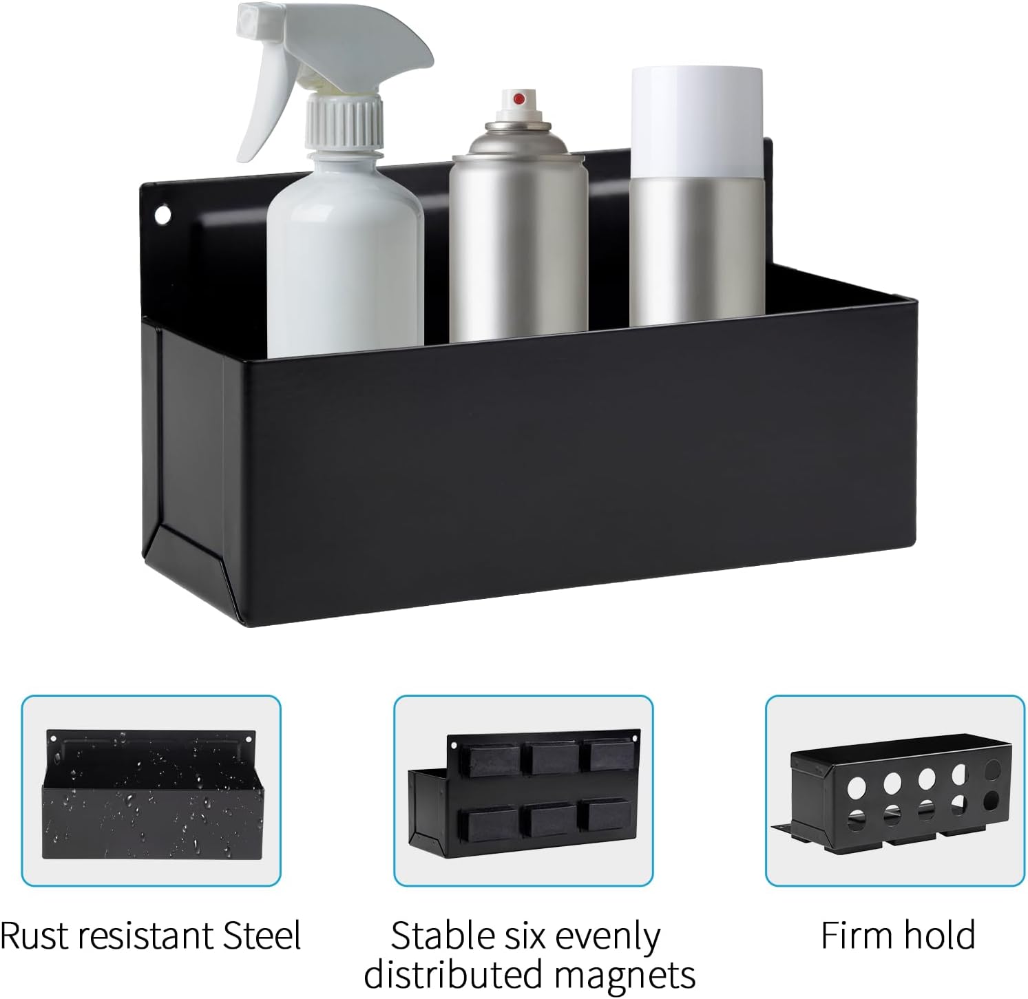 - Sturdy Steel Construction: Made of premium steel, this magnetic can holder is built to last, rust resistant and won’t fade. It securely attaches to any metal surface, providing a reliable storage solution for various bottles and aerosol cans. Say goodbye to wall damage and hello to a seamless organization.