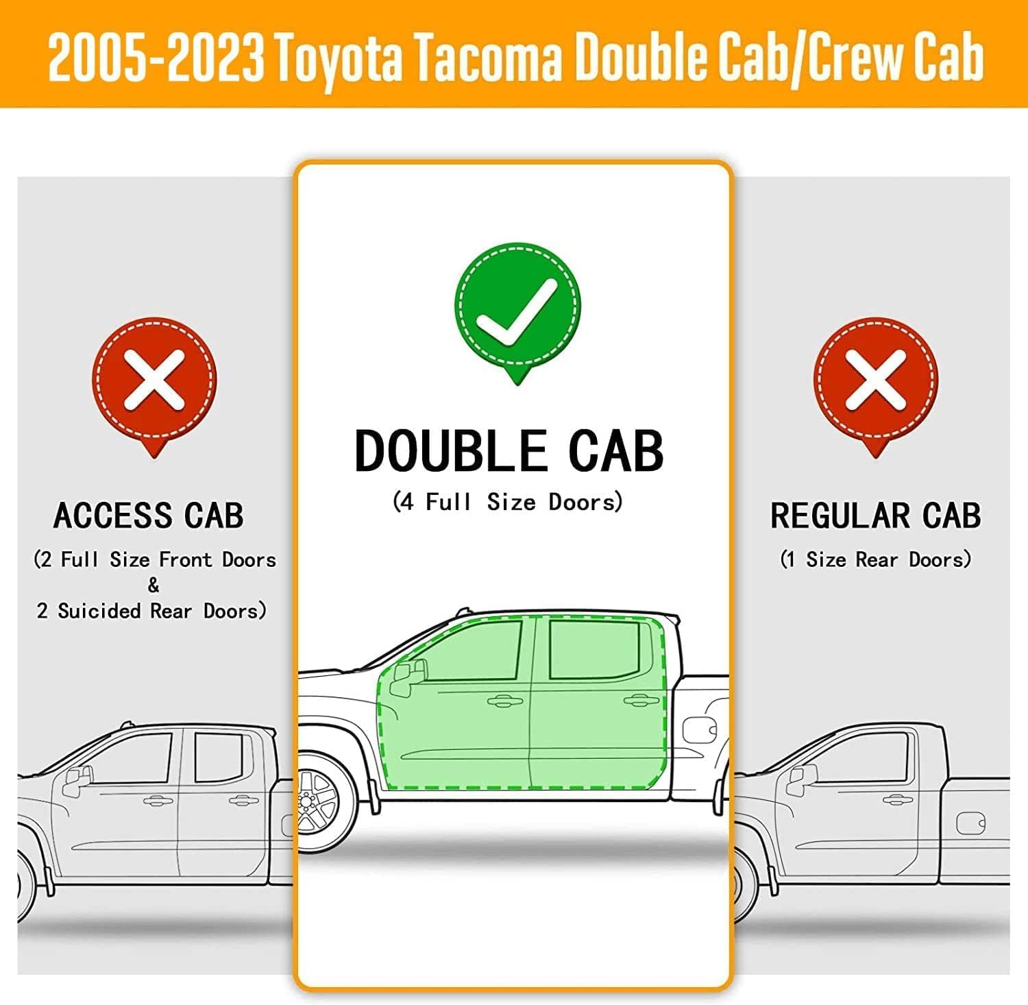 - Vehicle Service Type : 2005-2023 Tacoma Double Cab with 4 Full-size Doors