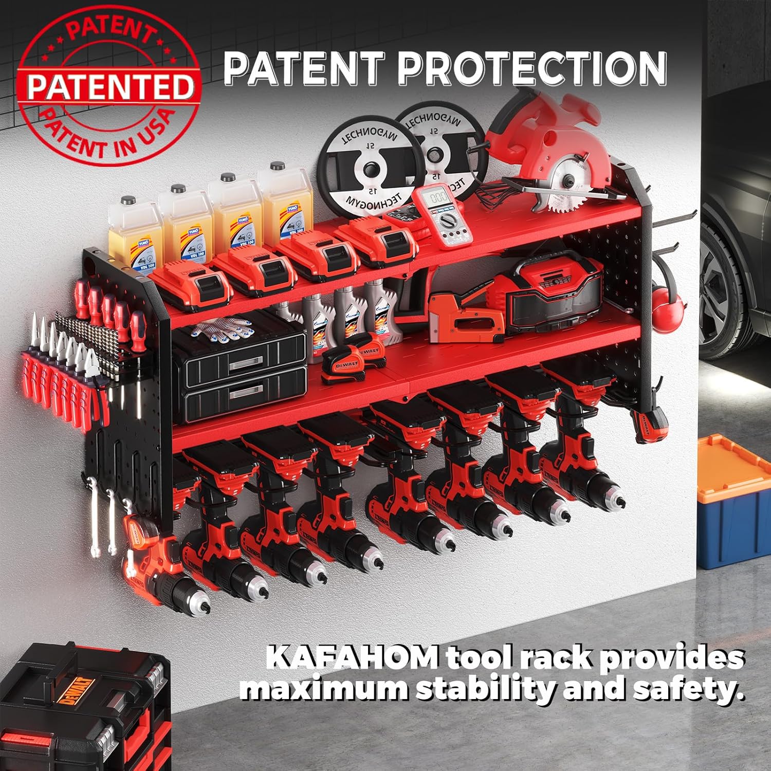 - STRUCTURAL OPTIMIZATION: The KAFAHOM top-of-the-line garage organization rack features a revolutionary structure design that provides exceptional stability and increased weight capacity for your power tools. Thanks to the optimized structural design and aspect ratio - not only is it can perfect for the 16" wall studs, but the utility cordless drill holder can be mounted on concrete, drywall, pegboard. Plus, the lower part can hold up to 8 heavy power tools.