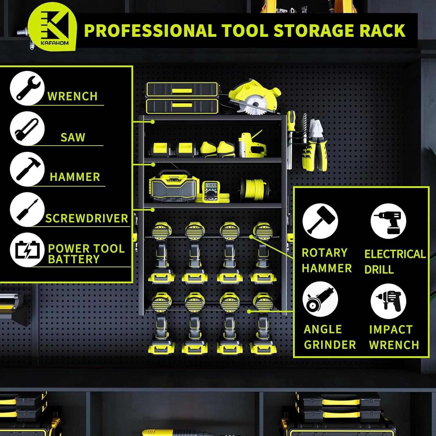 - COMPACT SOLUTION: KAFAHOM tool organization and storage has a high capacity for all your tools! With two downside racks, it can hold up to 8 drills and heavy-duty shanked power tools, while the 3 extra upper layers provide ample space for accessories such as hardware boxes, wrenches, screwdrivers, and pliers. With clever space design, our tool rack wall mount shelf helps free up space and keep your garage organization area clean and tidy.