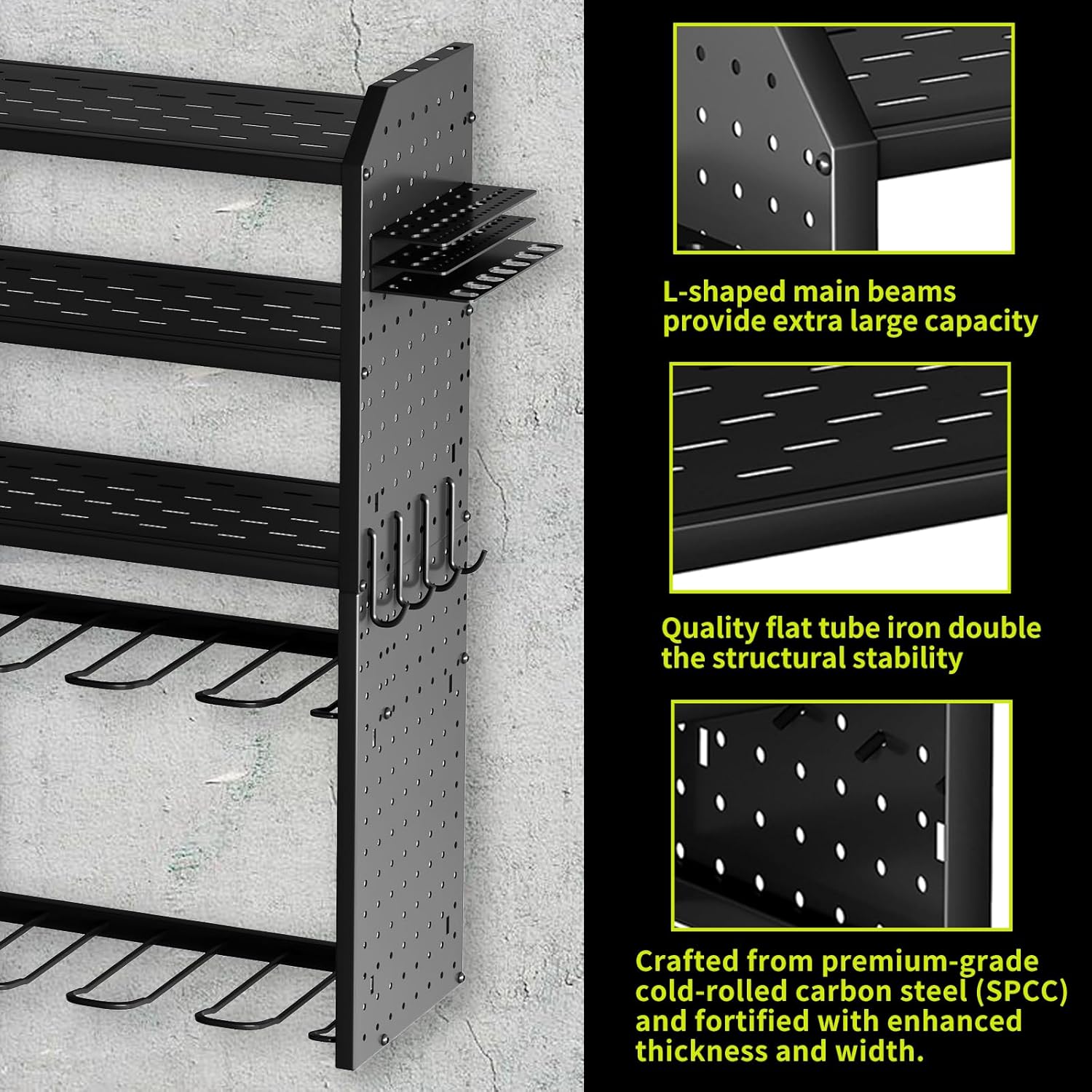 - EXTRA SPACE: Besides the main body of the KAFAHOM garage wall shelving, we add more to accommodate the small parts to handle the mess and clutter. An extra side rack can hold over 30 drill bits in different sizes and styles and be a clean space for every handy stick-shaped tool like screwdrivers, pry bars, glue applicators, Etc.Amazing christmas or father's day gift for men.