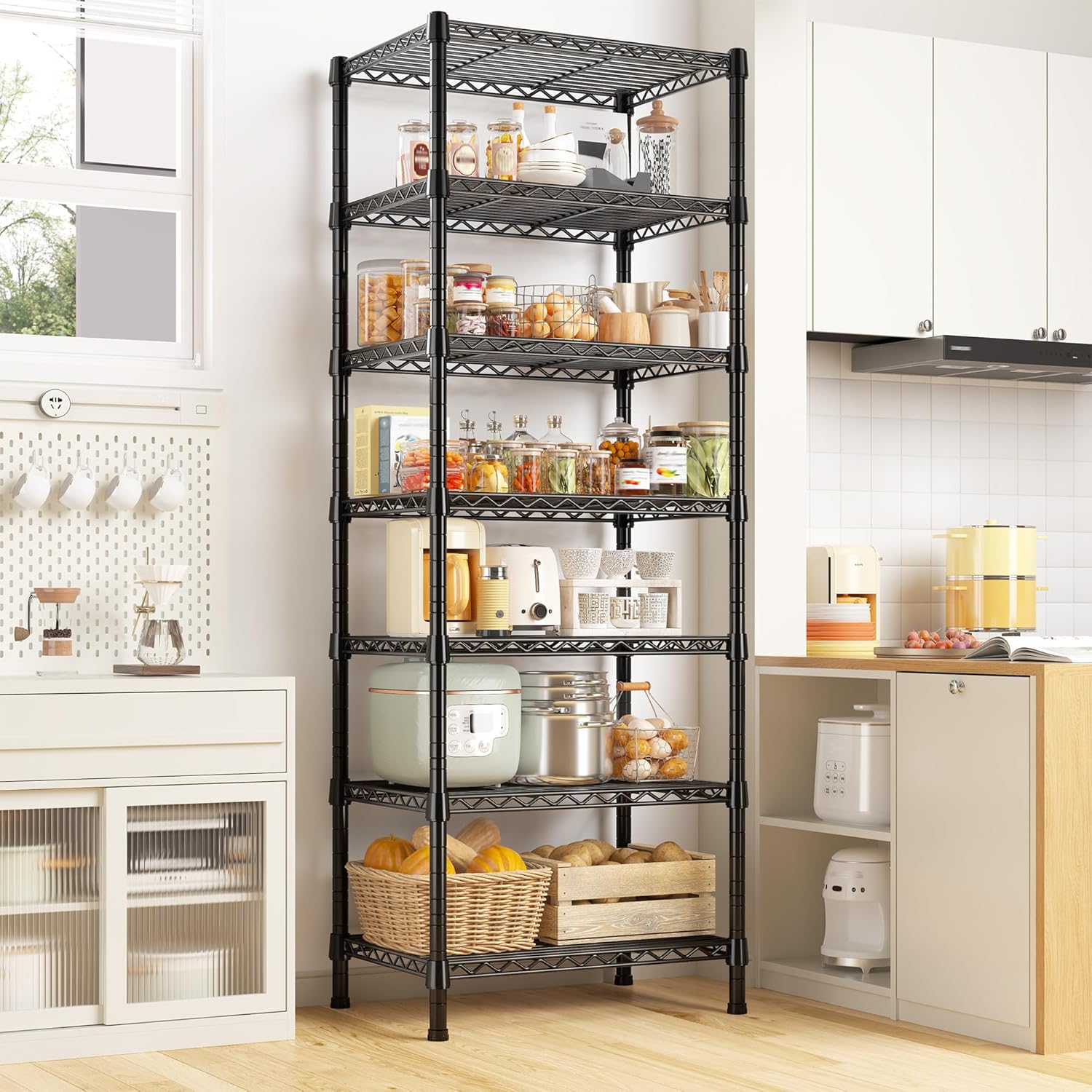 - 【71 “H X 18”W X 18 “D Compact Size & Lightweight Material】Dorm room essentials! This wire shelving rack’s size-71 “H X 18”W X 18 “D .This 7 tier shelving unit and storage not only provides you with additional storage space in narrow space, helping you store bottles, canned food, seasonings, snacks, boxes, but also uses lightweight materials for easy movement and portability