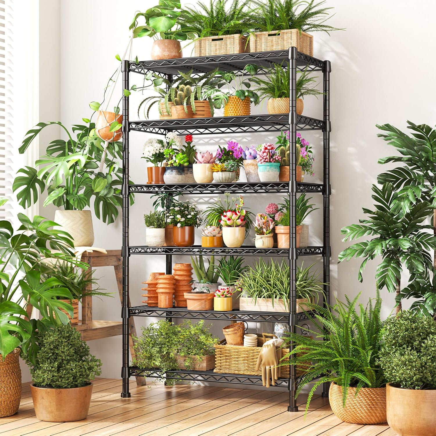 - 【Metal Shelving Heavy Duty Load 1000LBS】The wire shelving rack are made of sturdy metal wire panels and 19.1 mm diameter metal rods. Each layer of wire board has dense grid lines, which can be more load-bearing and durable than ordinary shelf. The shelving unit is very strong and stable, and can hold up to 1000 lbs. Each layer of the metal shelves for storage can bear 133LBS
