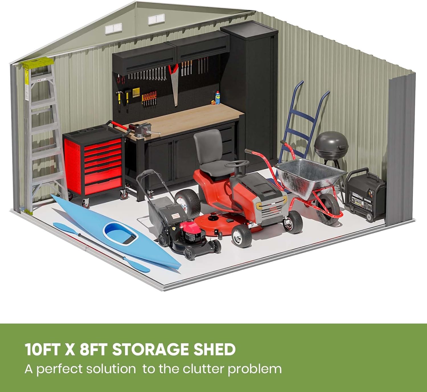 - Dimensions: The 10'x8' metal shed offers a total floor area of 85 square feet, providing sufficient space for storing garden equipment, tools, bicycles, and other items. With a peak height of around 6.3 feet, it offers ample headroom for most users to move comfortably inside.