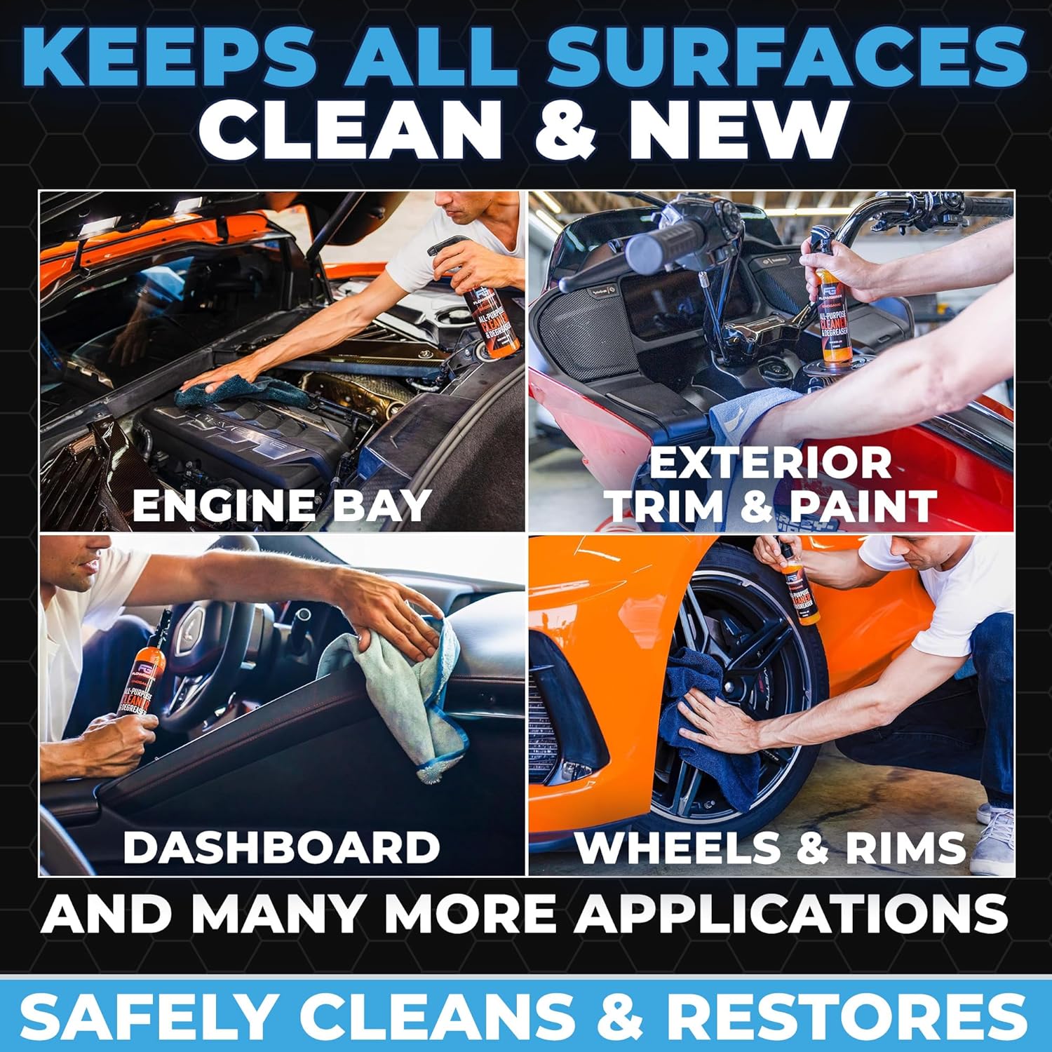 - 🚗 EXTEND THE LIFE OF YOUR VEHICLE: Your car or motorcycle is more than just a mode of transportation — it's a valuable investment. Protect its interior and exterior with ease using this convenient and powerful all-purpose cleaner. Comes with 2 complementary edgeless Premium Microfiber Towels (380 GSM, 16x16 inch) for safe and effective application and drying, ensuring a flawless finish every time.