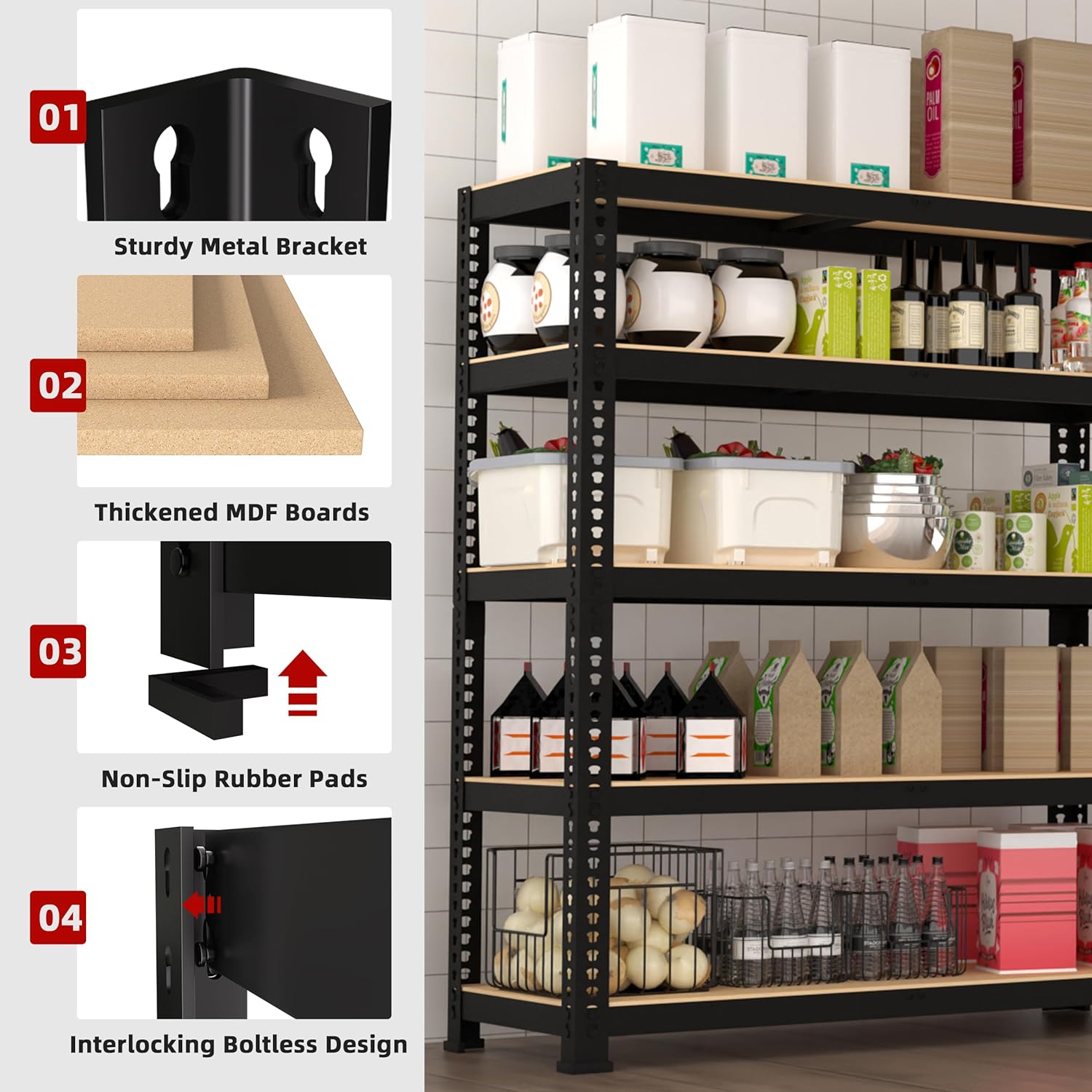 - - Built to Hold More: Featuring a heavy-duty metal frame and premium MDF boards, BuxWellBang garage storage shelves Max. load capacity is 300 lbs per layer shelf (evenly distributed) without buckling or breaking, 5 tier shelves' total max load capacity is 1500 lbs. The rock-solid construction of storage shelf ensures greater strength, longevity, and stability—a storage rack you can trust for the long hauls
