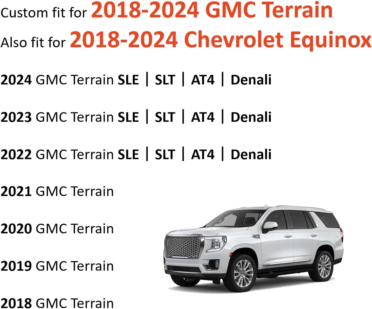 - All-weather protection: 2021 GMC Terrain floor mat designed with a high outsidewalls that help contain rain, snow, muddy fallen leaves, food debris, liquids or debris, giving your car perfect protection in all weather and keeping your car clean. Binmotor vehicles floorliners are designed to stand up to the most extreme weather conditions. Multiple tests prove that it won't crack, curl or break down.