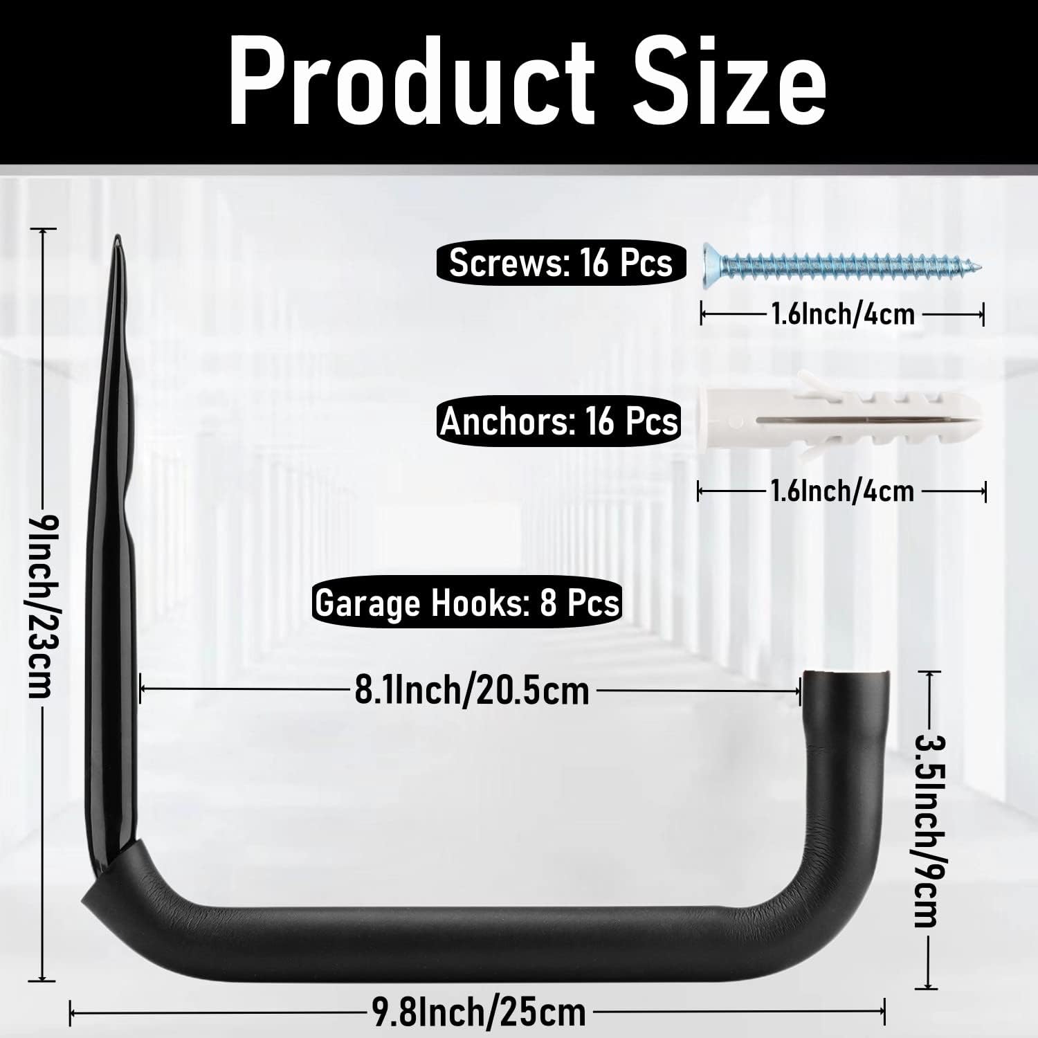 - SIZE & PACKAGE: Whrsinlor utility hooks is a set of 8 wall mount hooks, with 16pcs screws and 16pcs anchors, ladder storage hooks size is: 9Inch x 9.8Inch(H x W), wide inside 8.1 inch, the diameter of the tube is 0.63Inch/16mm.