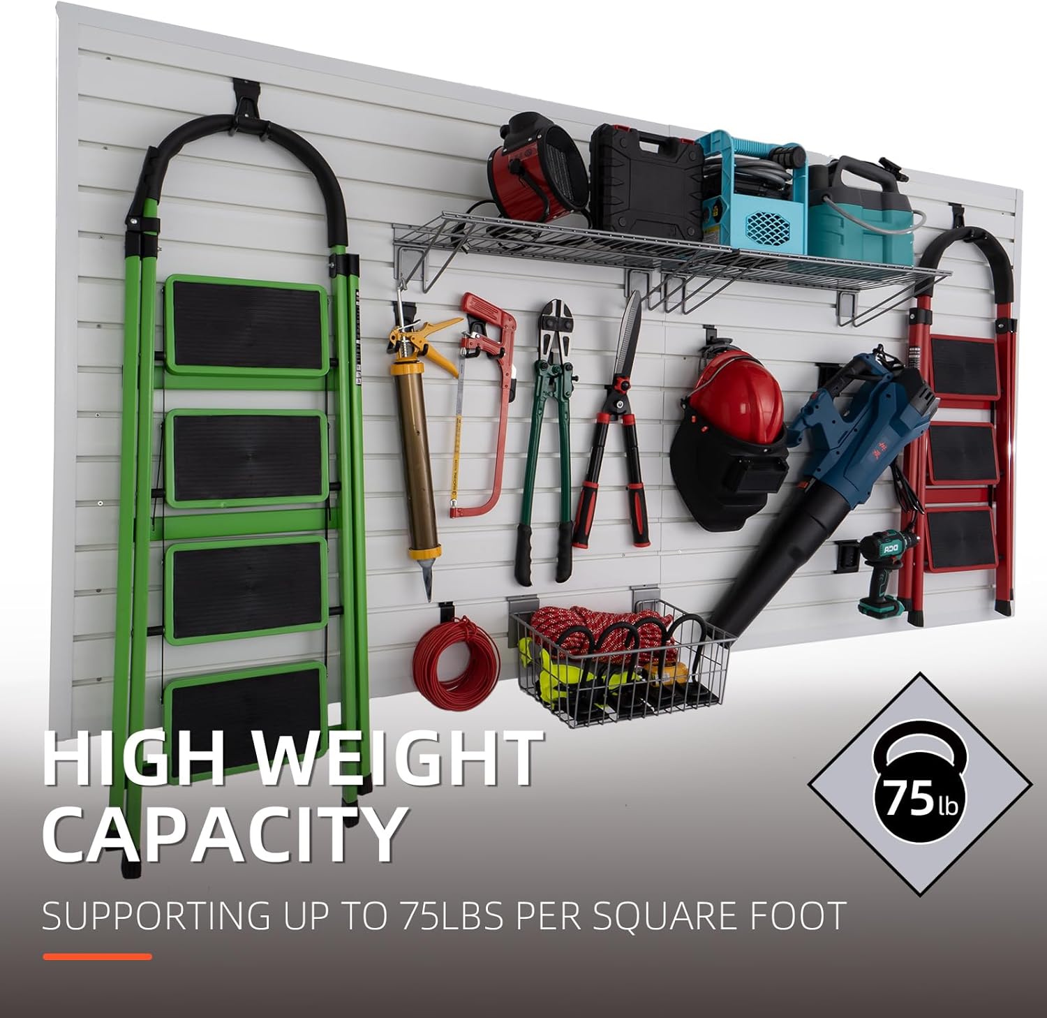 - MAKE FULL USE OF YOUR SPACE: Unleash the true potential of your garage wall organizer for tools with the garage slat wall panel. By making smart use of vertical wall space, you can revolutionize your garage into a seamlessly organized and efficient area. Bid farewell to a messy garage and welcome a meticulously optimized space that maximizes every inch available. Enjoy effortless access to your tools, equipment, and accessories, all while crafting a visually captivating environment.