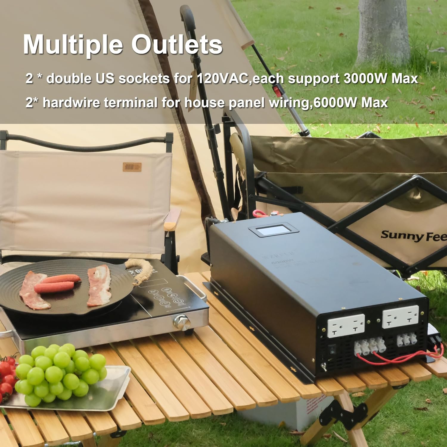 - POWERFUL: 6000 watts continuous, 12000 watts peak power, 24 volt DC to 120V 240V AC split phase true sine wave inverter, built-in soft starter, high frequency design with high surge capability to power demanding loads like air conditioner, refrigerator, power tools, and more