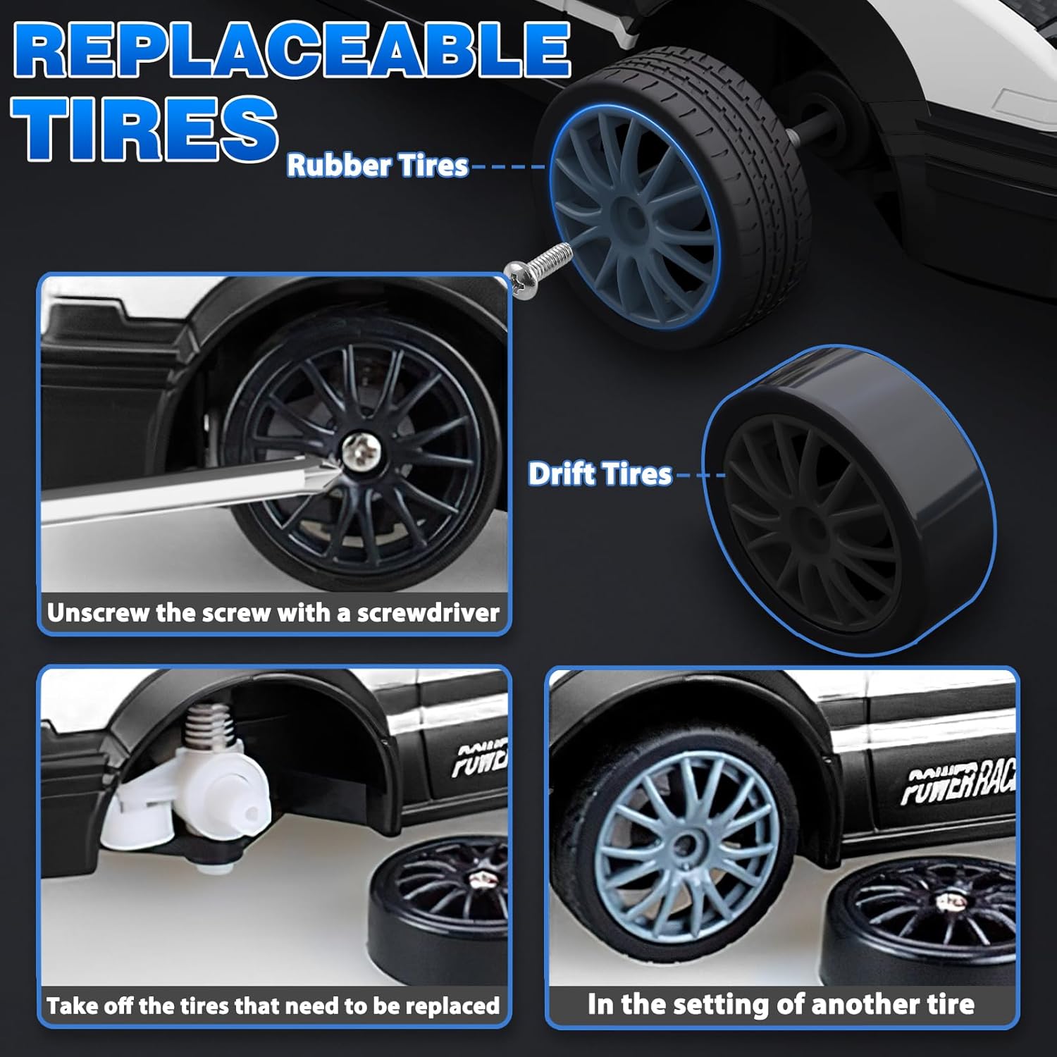 - Rechargeable Fast Car: Full function RC drift car with two rechargeable batteries. Don't worry about being out of charge anymore; Forward, reverse, left/right turn, front LED lights, U shaped drift, fiqure 8 drift, all-wheel drive
