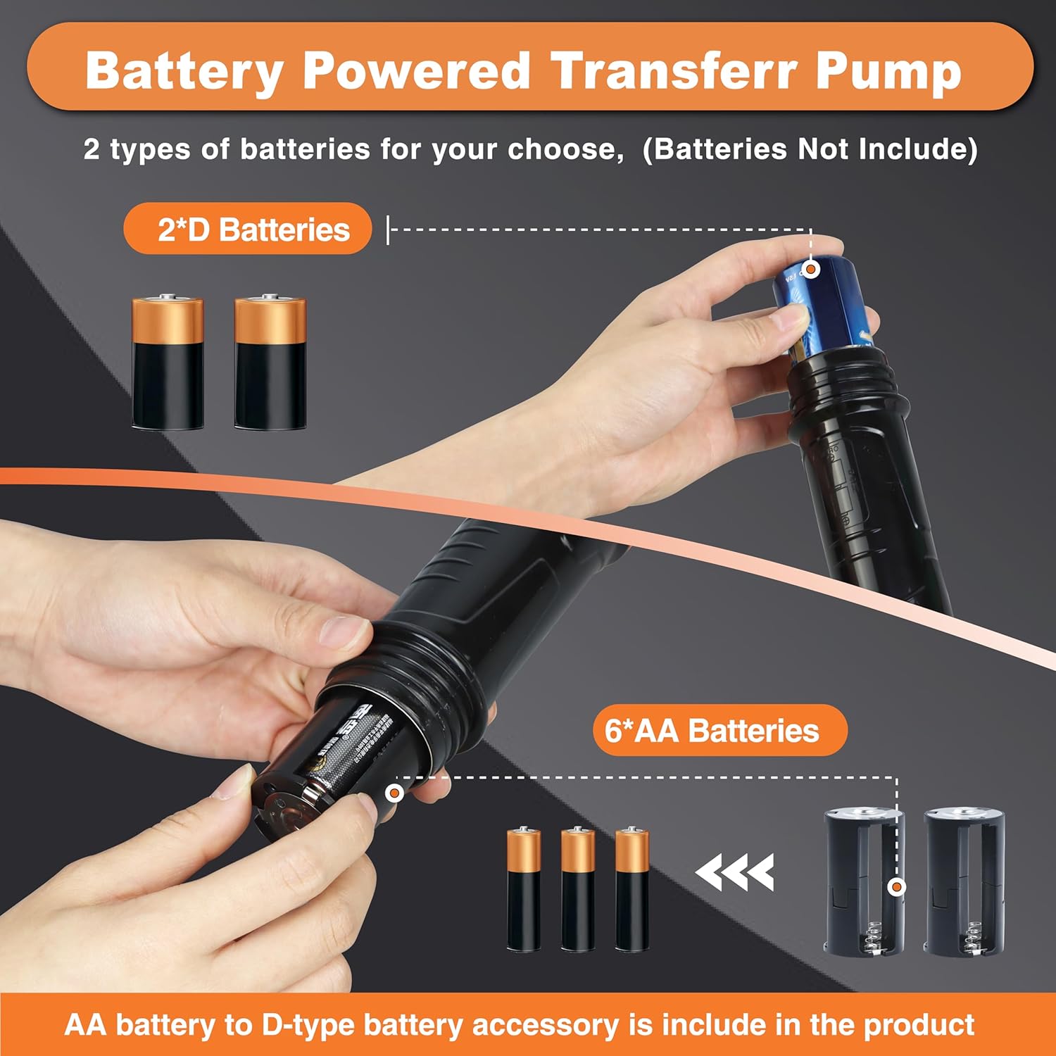 - PORTABLE AND CONVENIENT: Equipped with a battery conversion device, you can choose to use 2 D batteries or 6 AA batteries (BATTERIES NOT INCLEDED).You can also use 2 AA batteries in emergency situations. The connection between the hose and the pump is pre-fixed, so there is no need to bother connecting the hose and no worry about leakage.