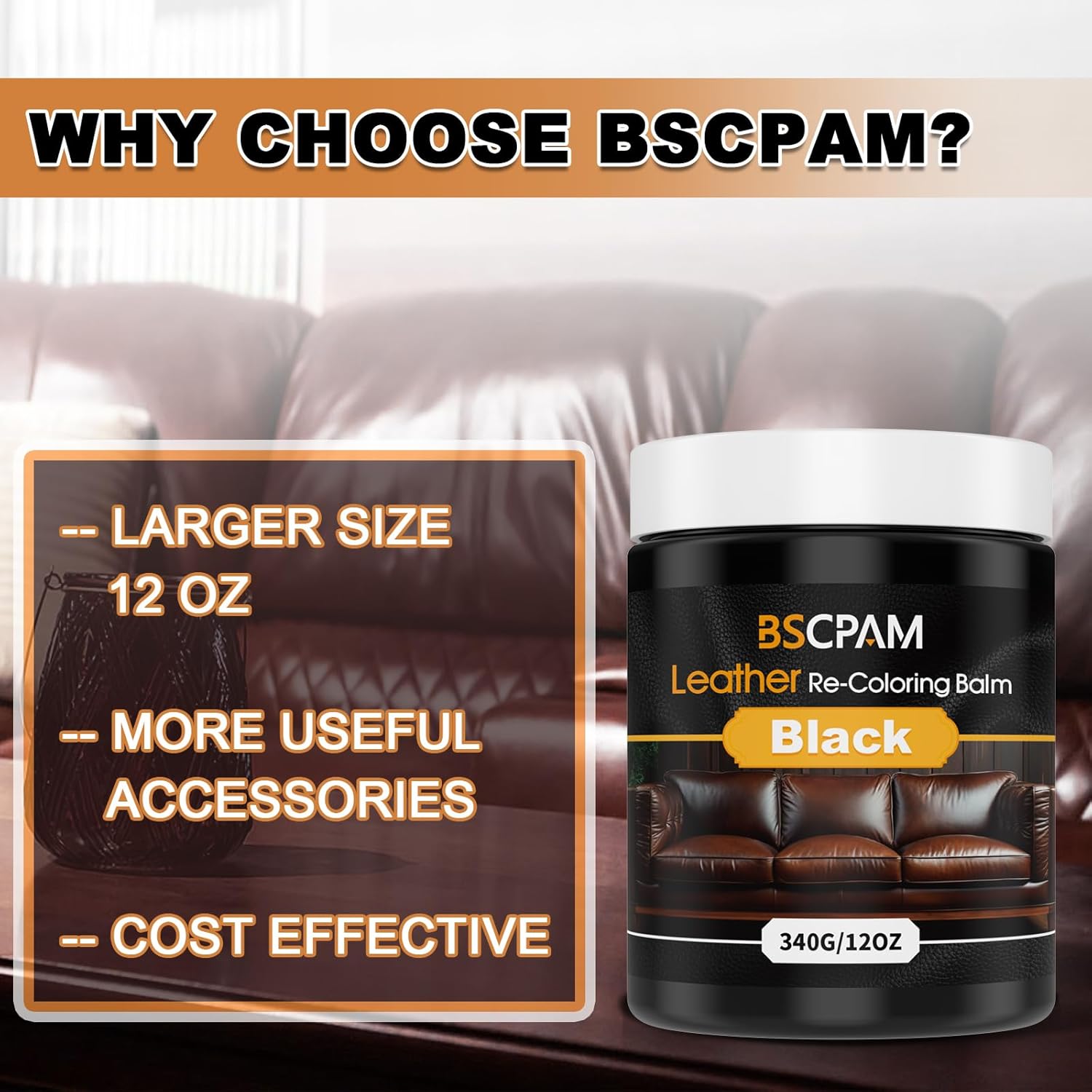 - Easy to Use: Our BSCPAM Black Leather Repair Kit for furniture includes a 12oz leather repair gel, three sponges, a paintbrush, a scraper, and gloves. Simply apply the colorant and let it dry naturally for 10-20 minutes, or speed up the process with a hairdryer for 1-2 minutes. (We recommend testing on a small area before full application.) It quickly restores your leather's original shine.