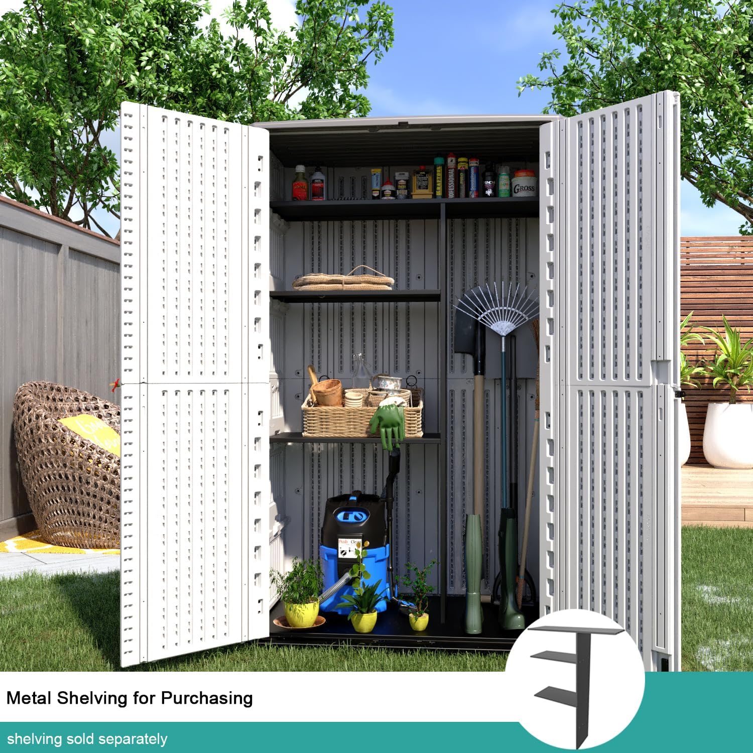 - [TO ENHANCE ITS USABILITY] — We provide additional 2 kinds of kinying shelves to enhance its usability, single laminate shelf and shelving kit, shelves need to be purchased separately. Plastic shed fits up to 4 single laminate shelves or a shelving kit.