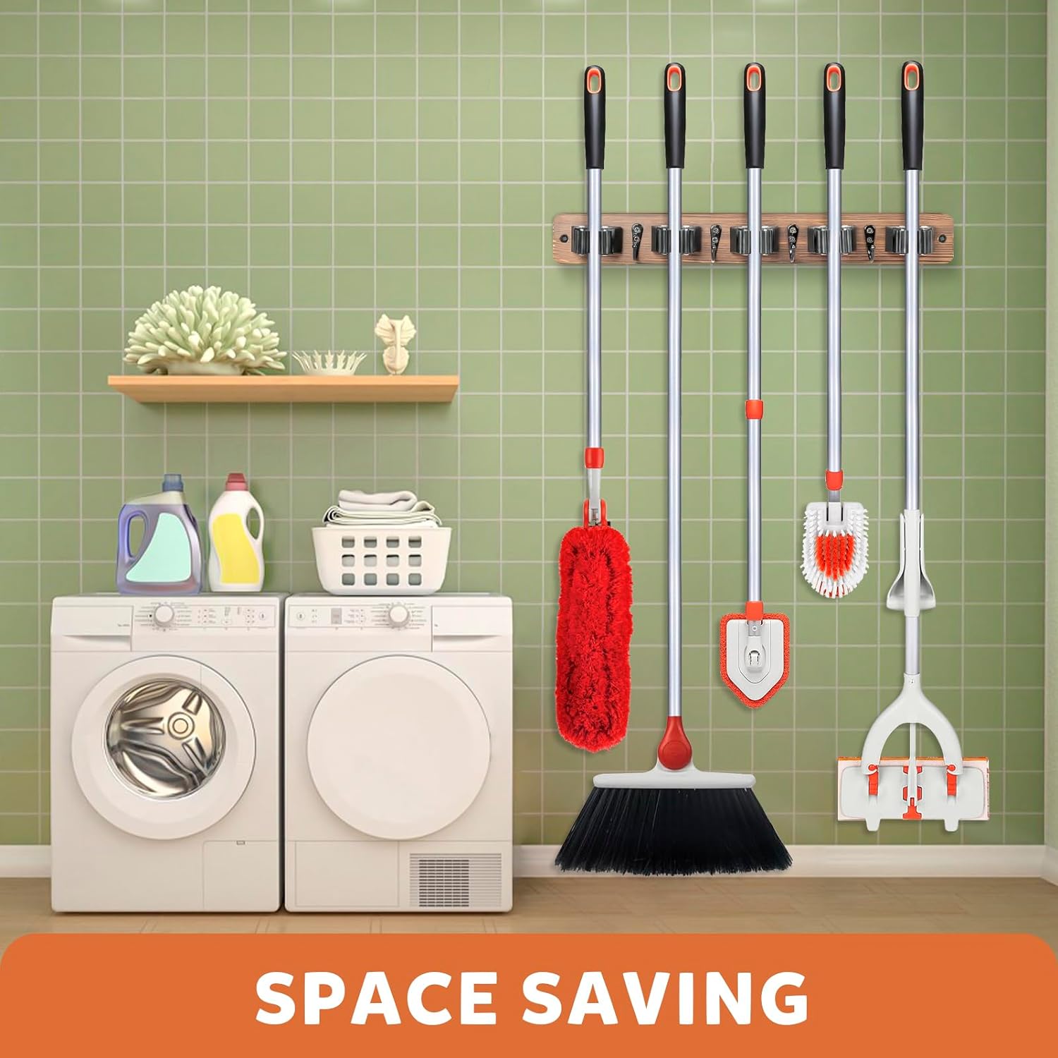 IMILLET Broom Holder Wall Mount, Rustic Wood Broom Hanger with 5 Racks and 4 Hooks, Laundry Room Organization and Storage, Mop Holder for Home Decor, Garden, Garage, Kitchen, Closet