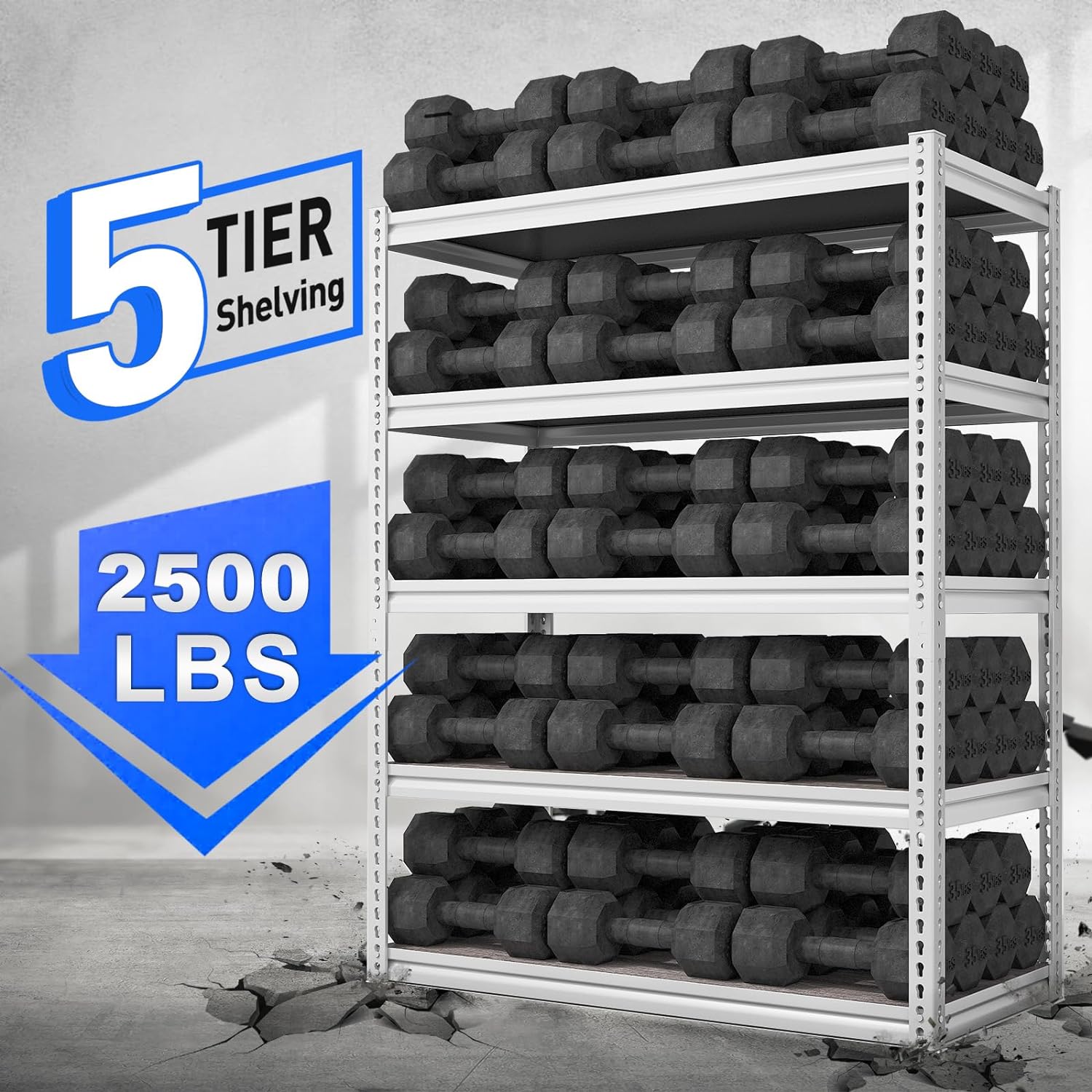 - 【2500LBS Capacity Garage Storage Shelves Heavy Duty】This garage shelving is made of high intense premium metal and thick overlaid laminate boards(E1 Grade, 0.35"), of which maximum load is 500 lbs per shelf (equal distribution). With a total bearing capacity of 2500 lbs, which makes 5 tier heavy duty shelving more stable and stores more stuff